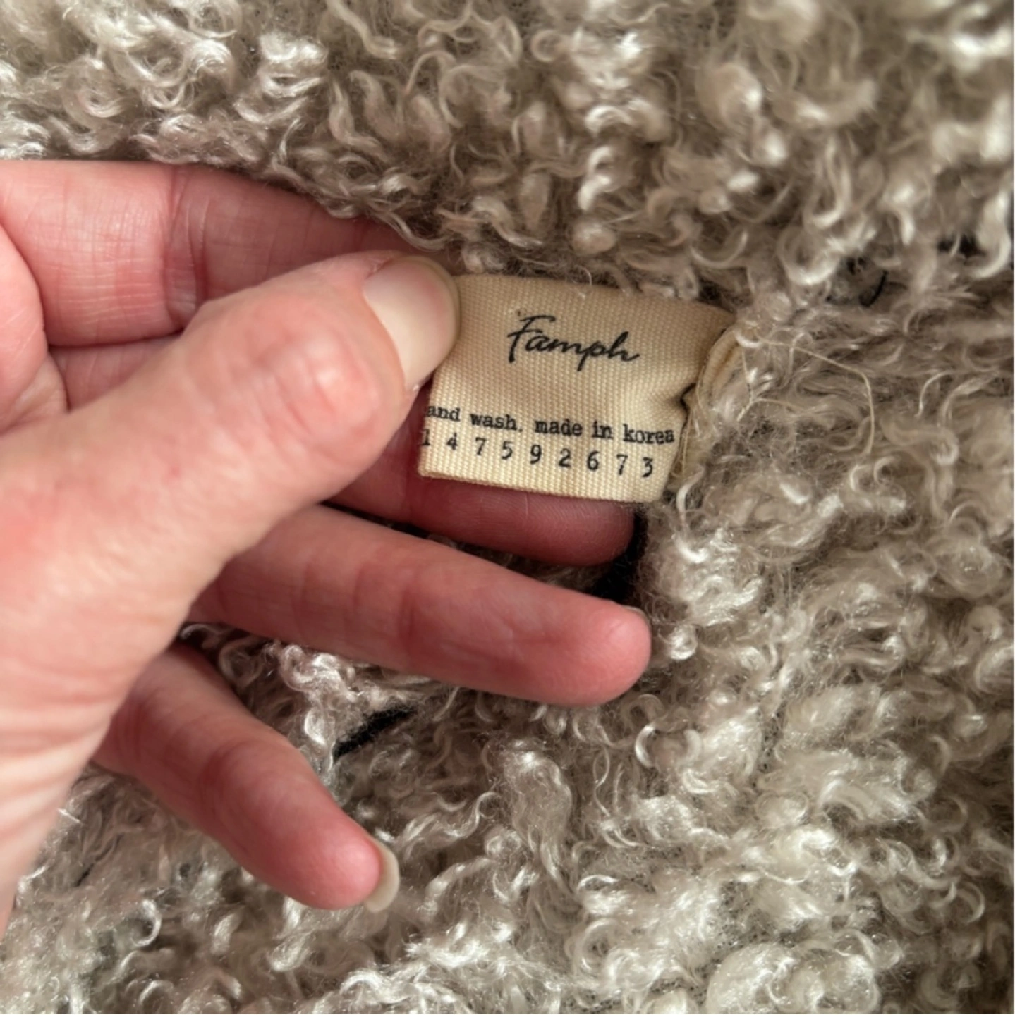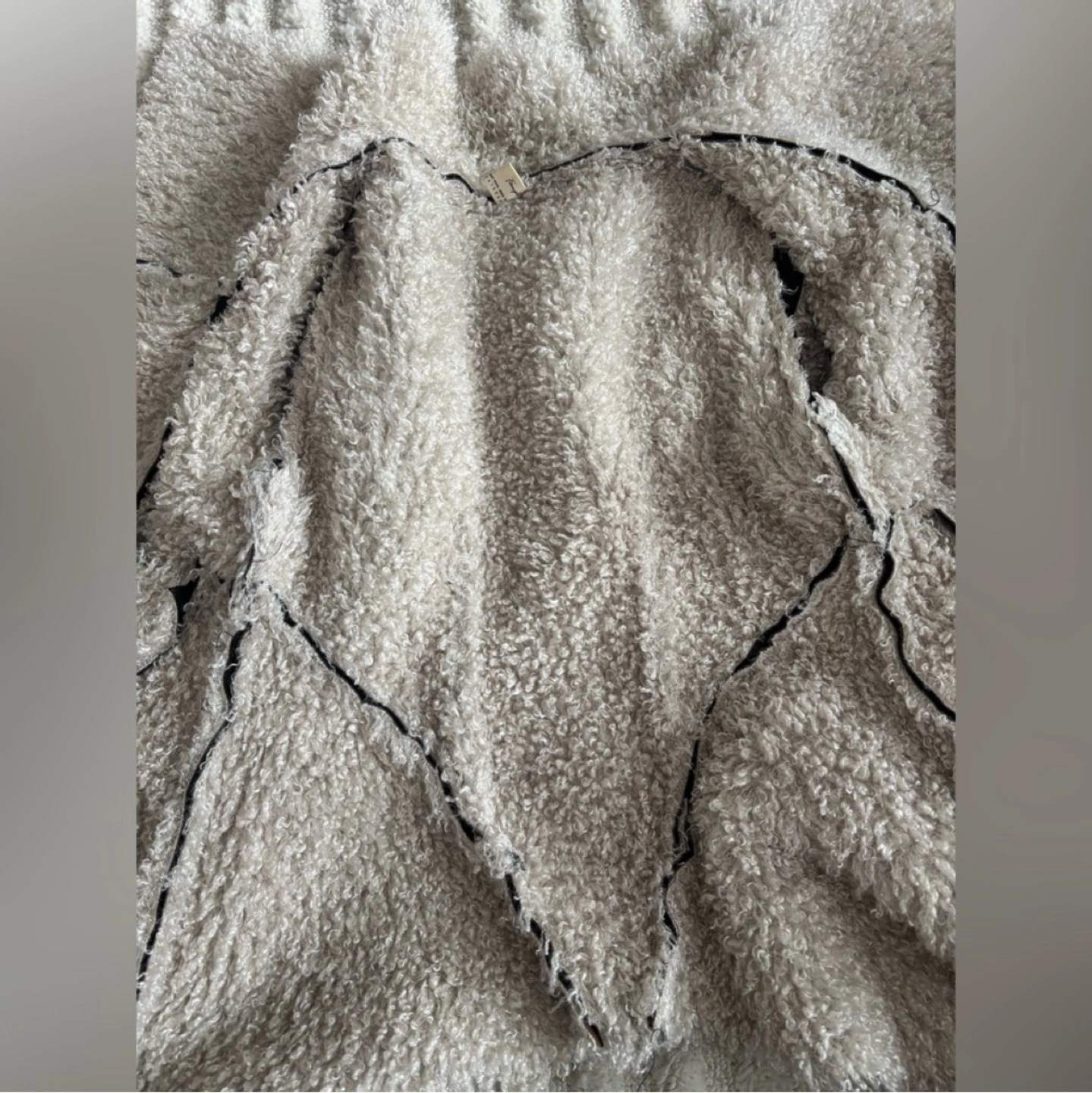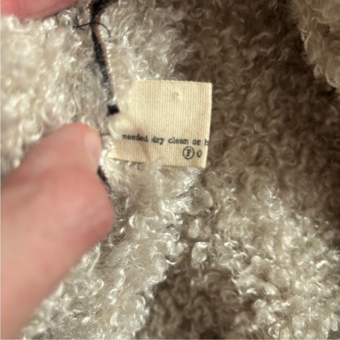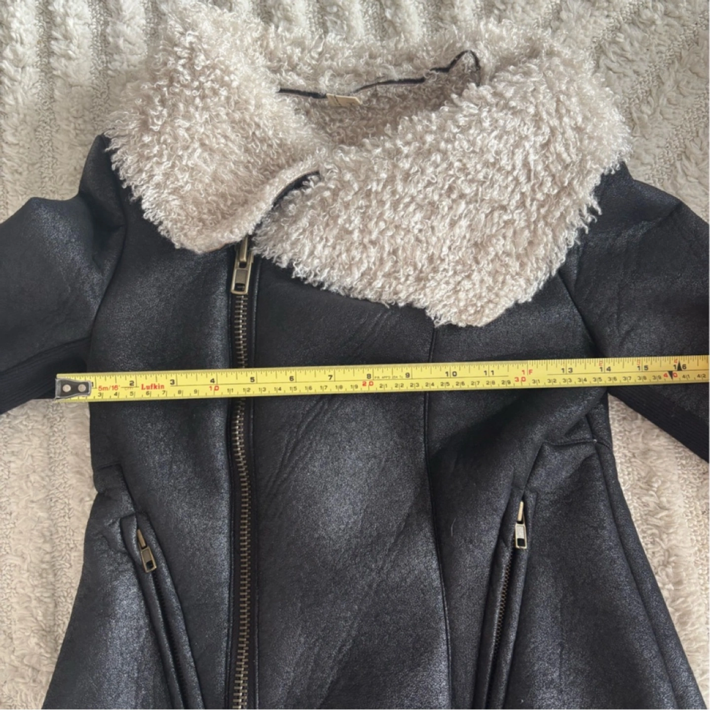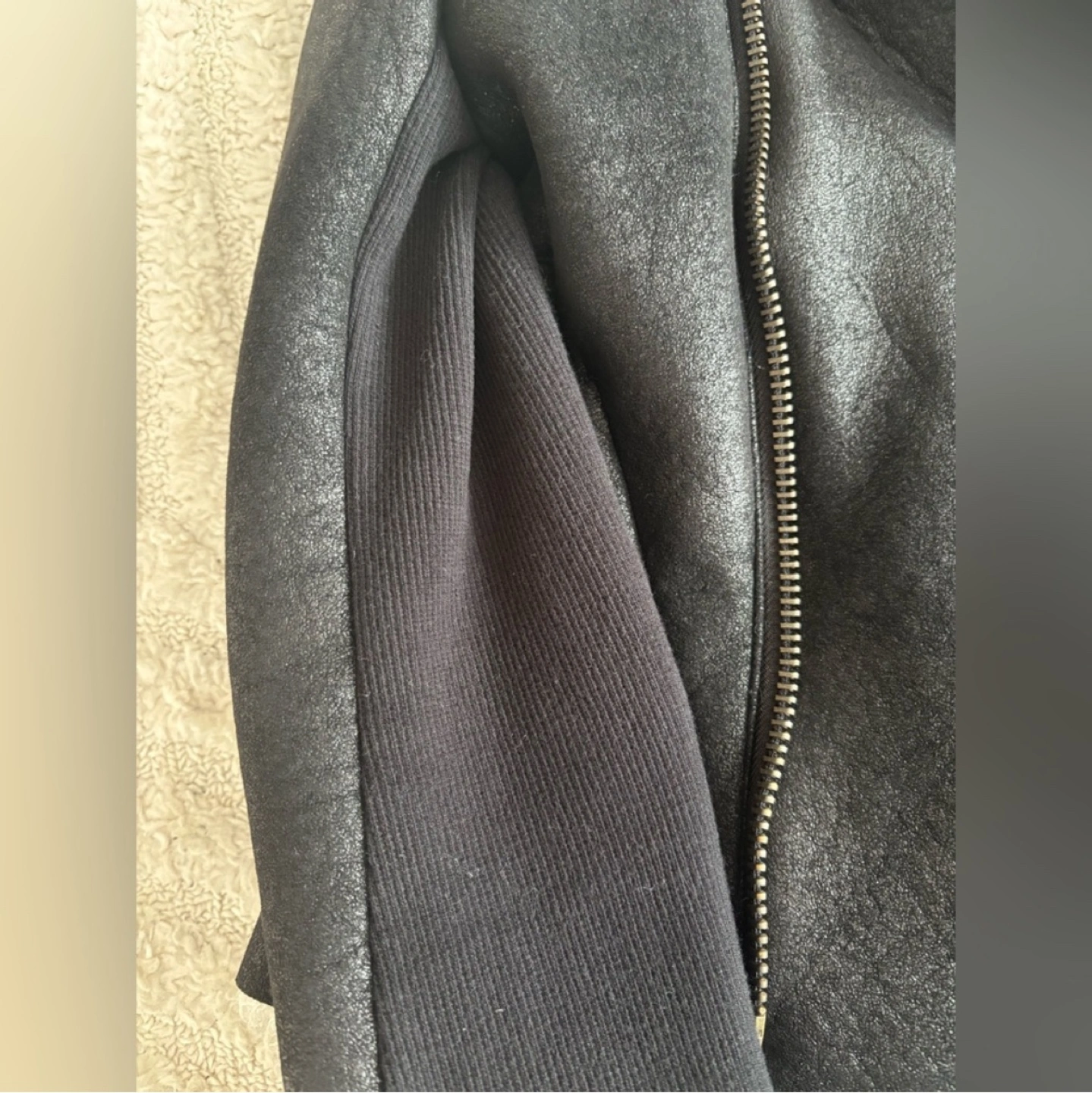 69Black faux leather jacket. Asymmetrical hem. Features a cream coloured sherpa collar and lining. Zip closure. Two zippered pockets. Ribbed arm detail. Only worn once.