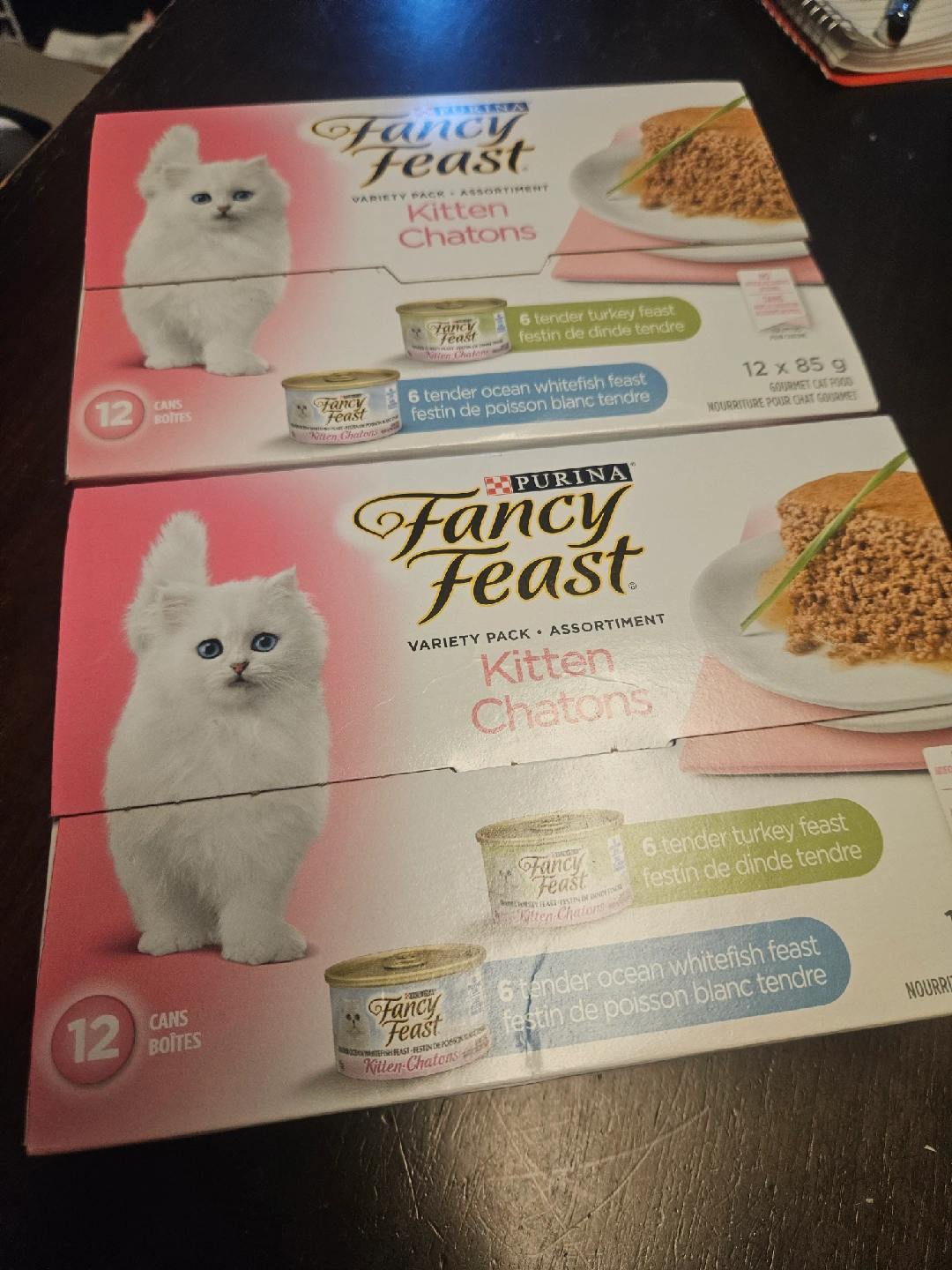 Selling a pack of Fancy Feast Kitten Variety Pack! It comes with 12 cans of gourmet cat food, perfect for your little kitten. Each can is 85g. It includes tender turkey feast and tender ocean whitefish feast flavours