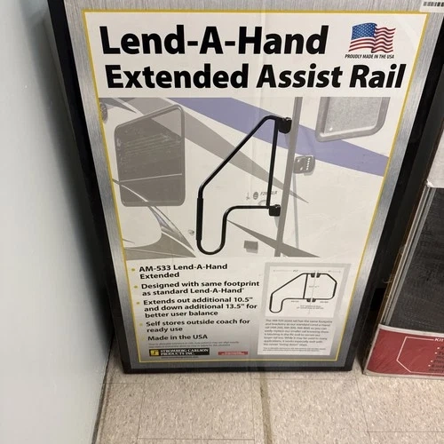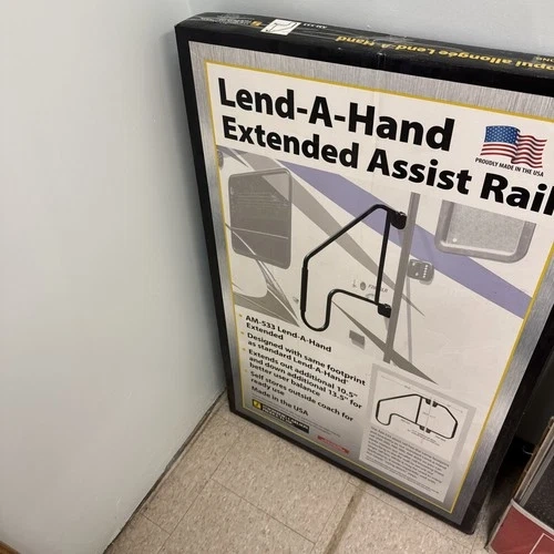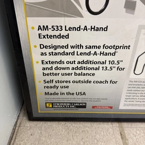 Enhance your RV experience with the Stromgberg Carlson Extended Lend A Handrail in sleek black, model number AM-533. Designed for durability and ease of use, this handrail provides added safety and convenience when navigating your RV's exterior. Crafted by Stromgberg Carlson, a trusted name in recreational vehicle accessories, this extended handrail is a practical addition to your camping gear. It features a robust construction and comes with a manufacturer part number of AM-533, ensuring a quality product.