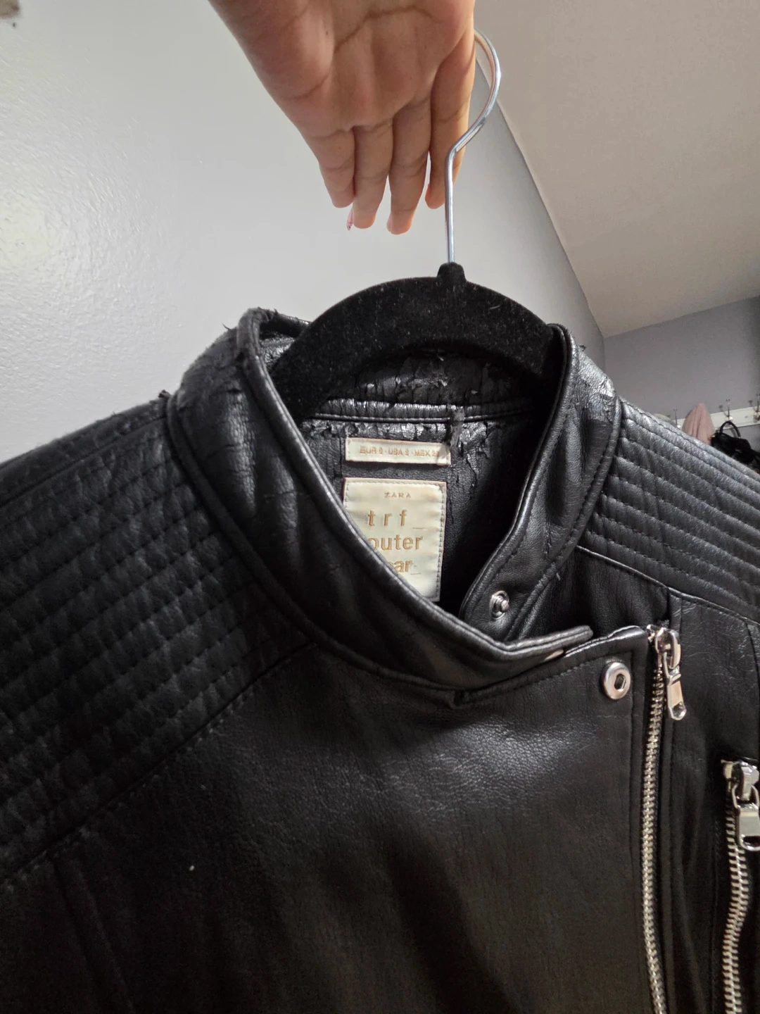 ZARA TRF faux leather biker jacket in black. Features quilted detailing on shoulders and sleeves, with a zip-front closure and multiple zip pockets. It's a size small