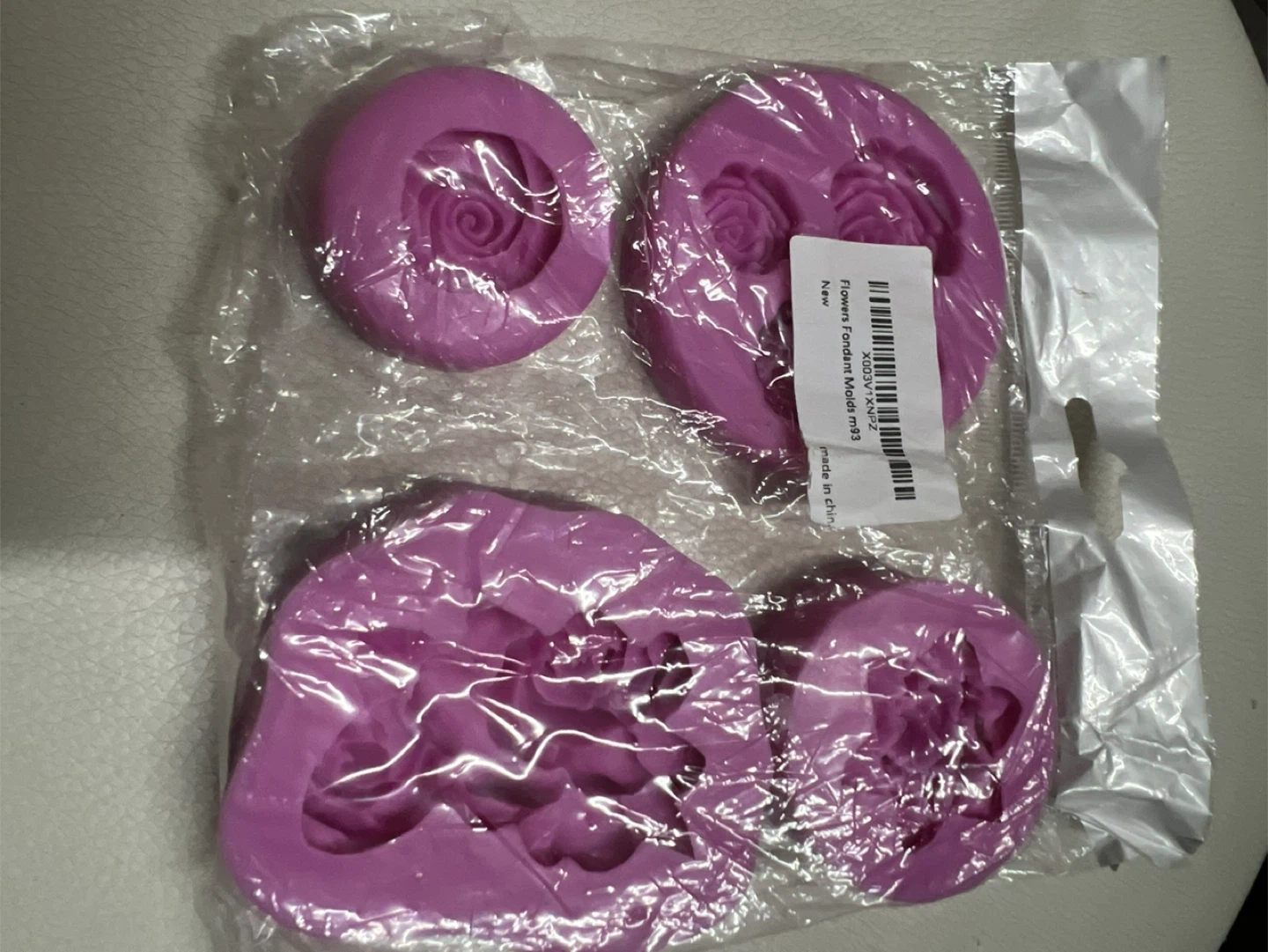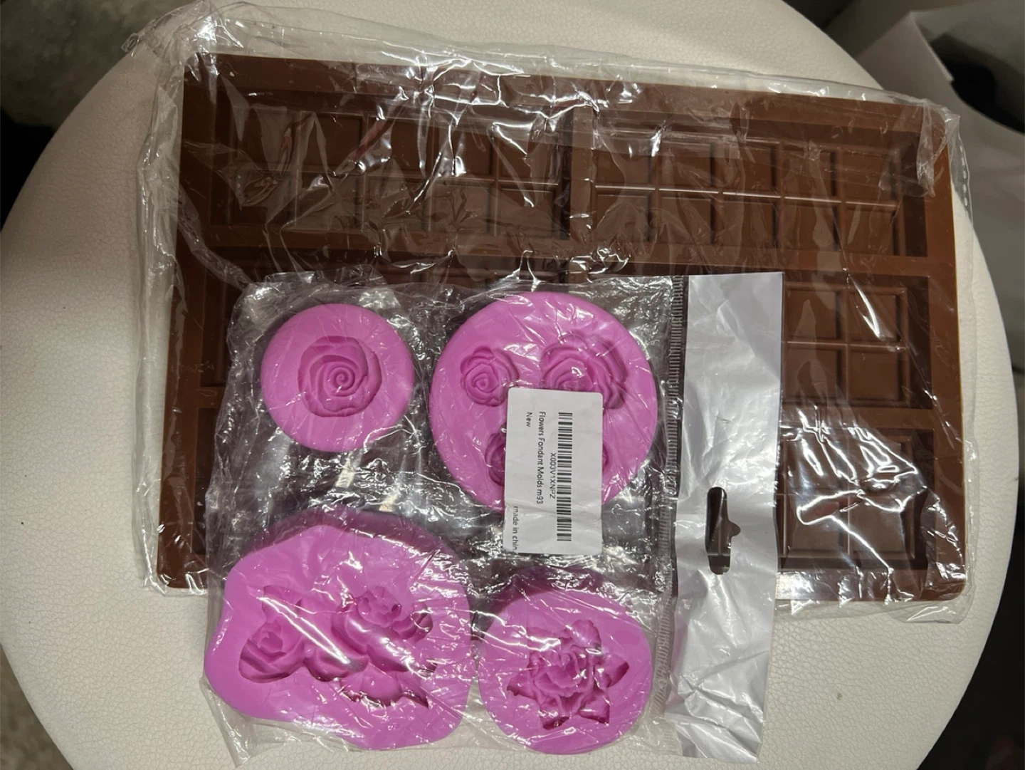 This set includes silicone molds for baking decorative flowers and chocolates. The flower molds create detailed rose designs. The chocolate mold features a bar pattern. Made from durable silicone for easy release.