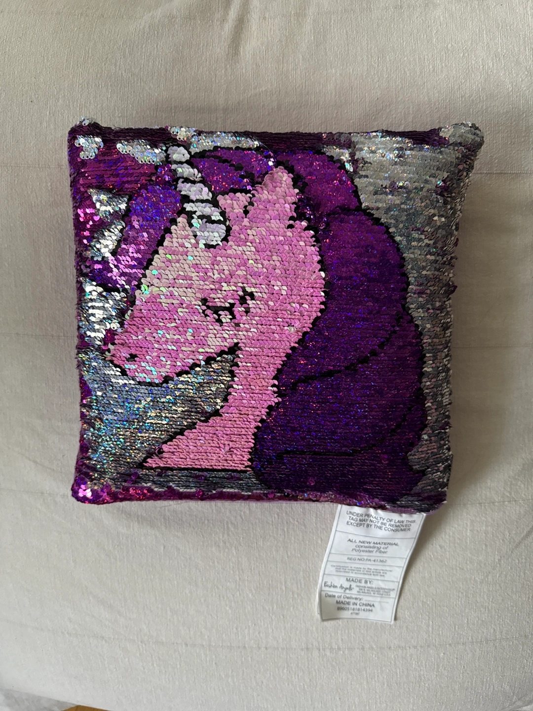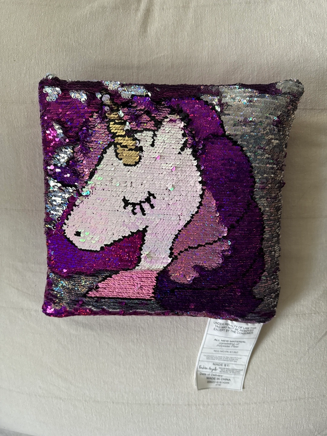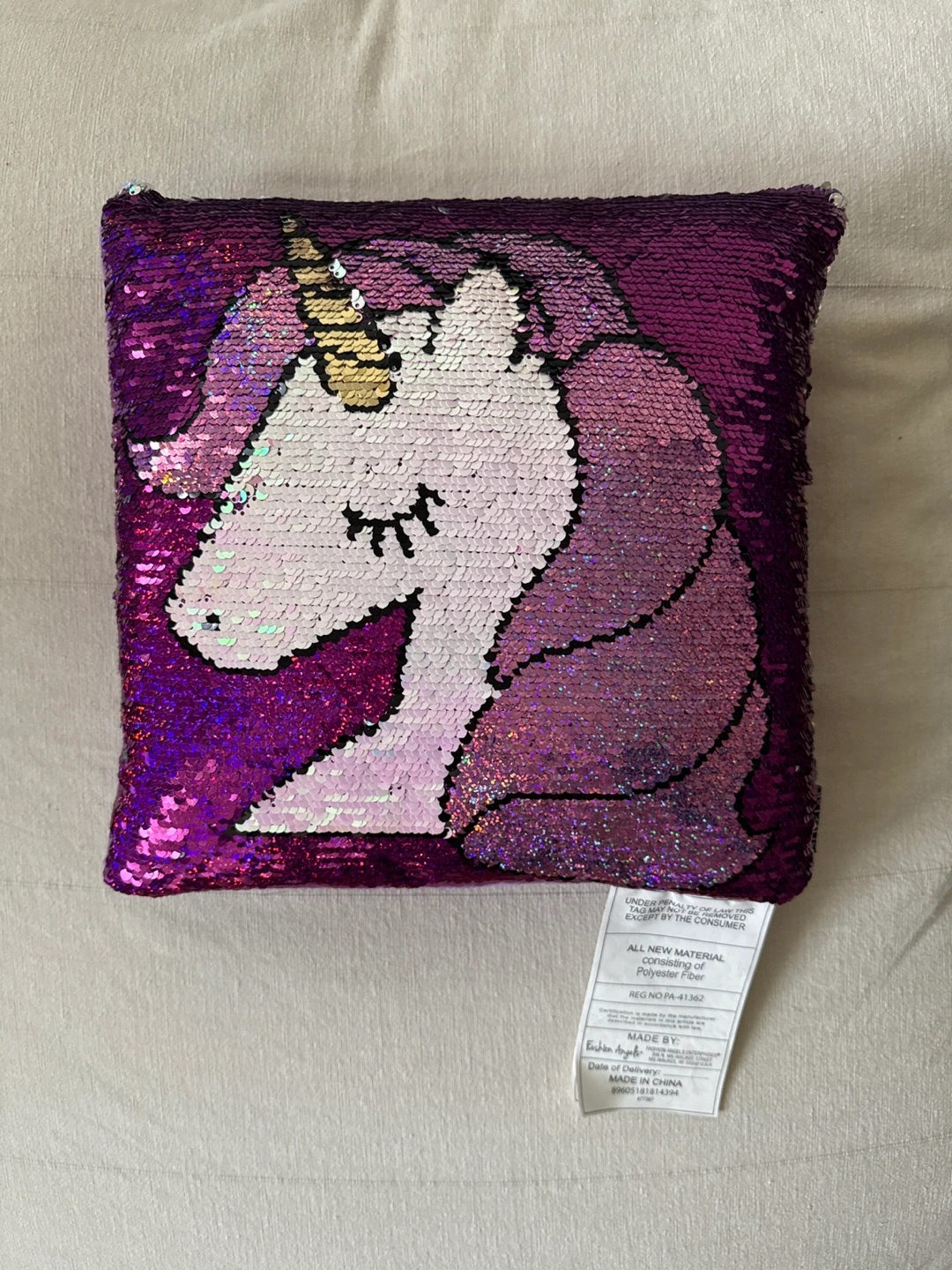 10Add a touch of magic to any room with this Fashion Angels unicorn sequin pillow! It features a fun sequin design that changes colour when you brush your hand across it. The back is a soft, plush purple velvet, making it extra cozy. Brush the sequins to change colour.