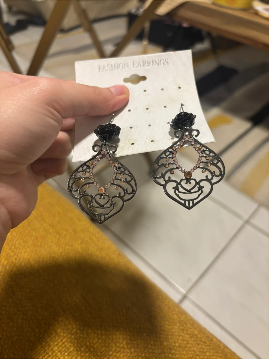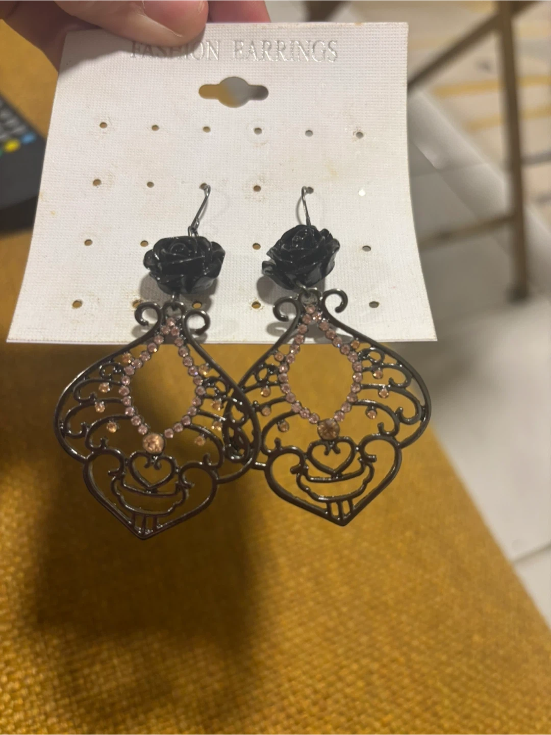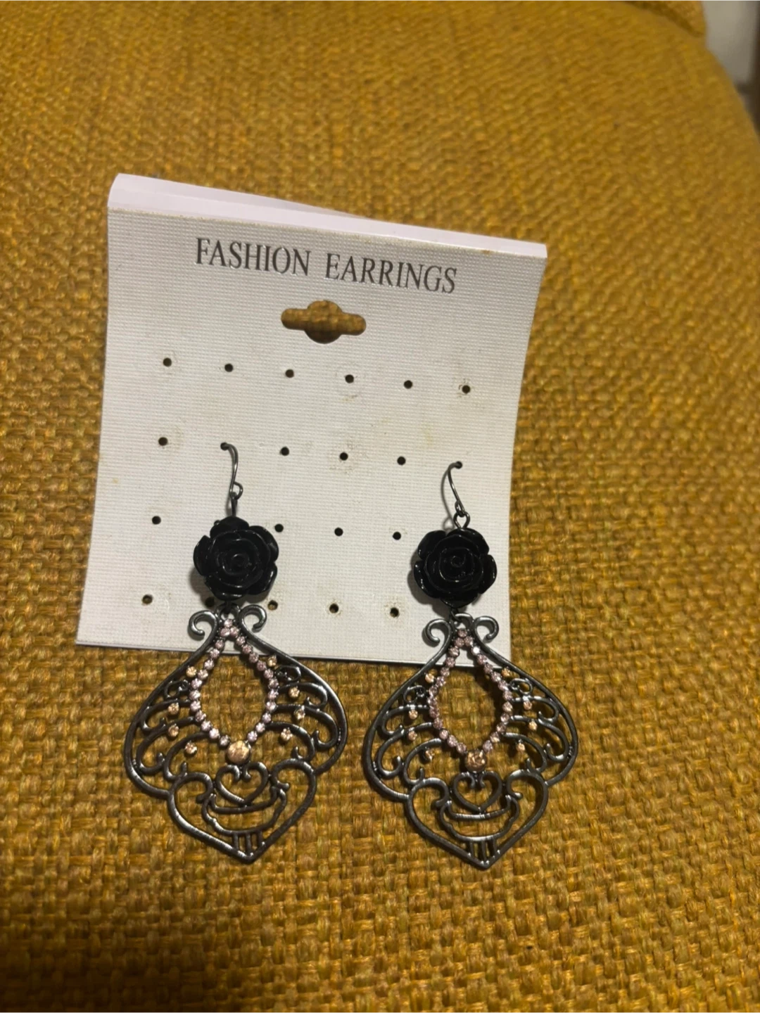 Selling a pair of fashion earrings with a black rose design. They're in great condition and ready to add a touch of elegance to your look!