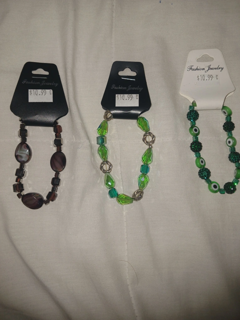 31Selling a set of three fashion jewelry bracelets. Each bracelet has a unique design with different coloured beads. They are new with tags and originally priced at $10.99 each!