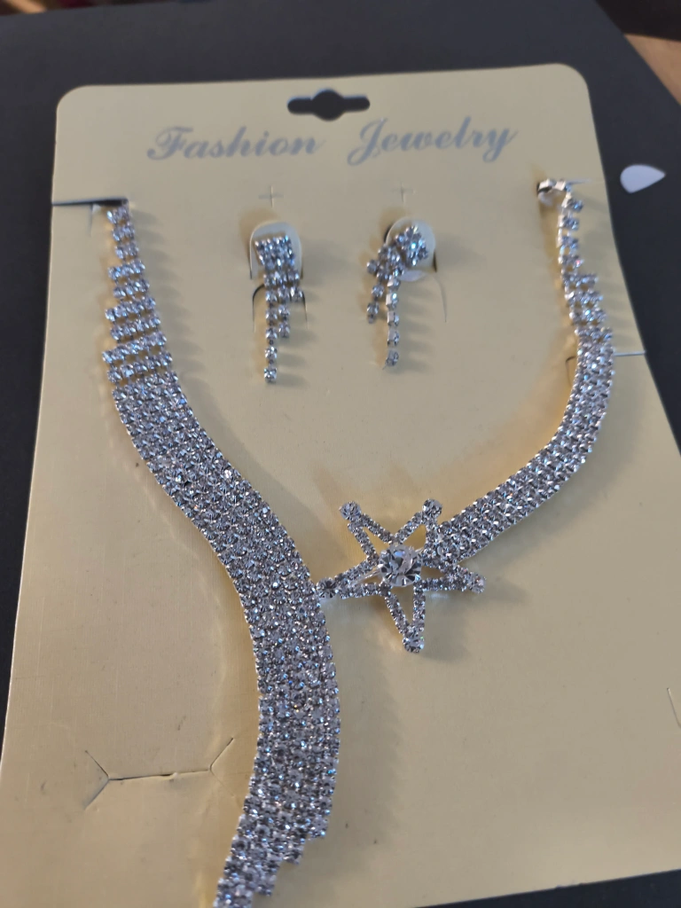 20Here's a charming fashion jewelry set, complete with a necklace and matching earrings! The set features a star design and is adorned with sparkling rhinestones. Perfect for adding a touch of elegance to any outfit!