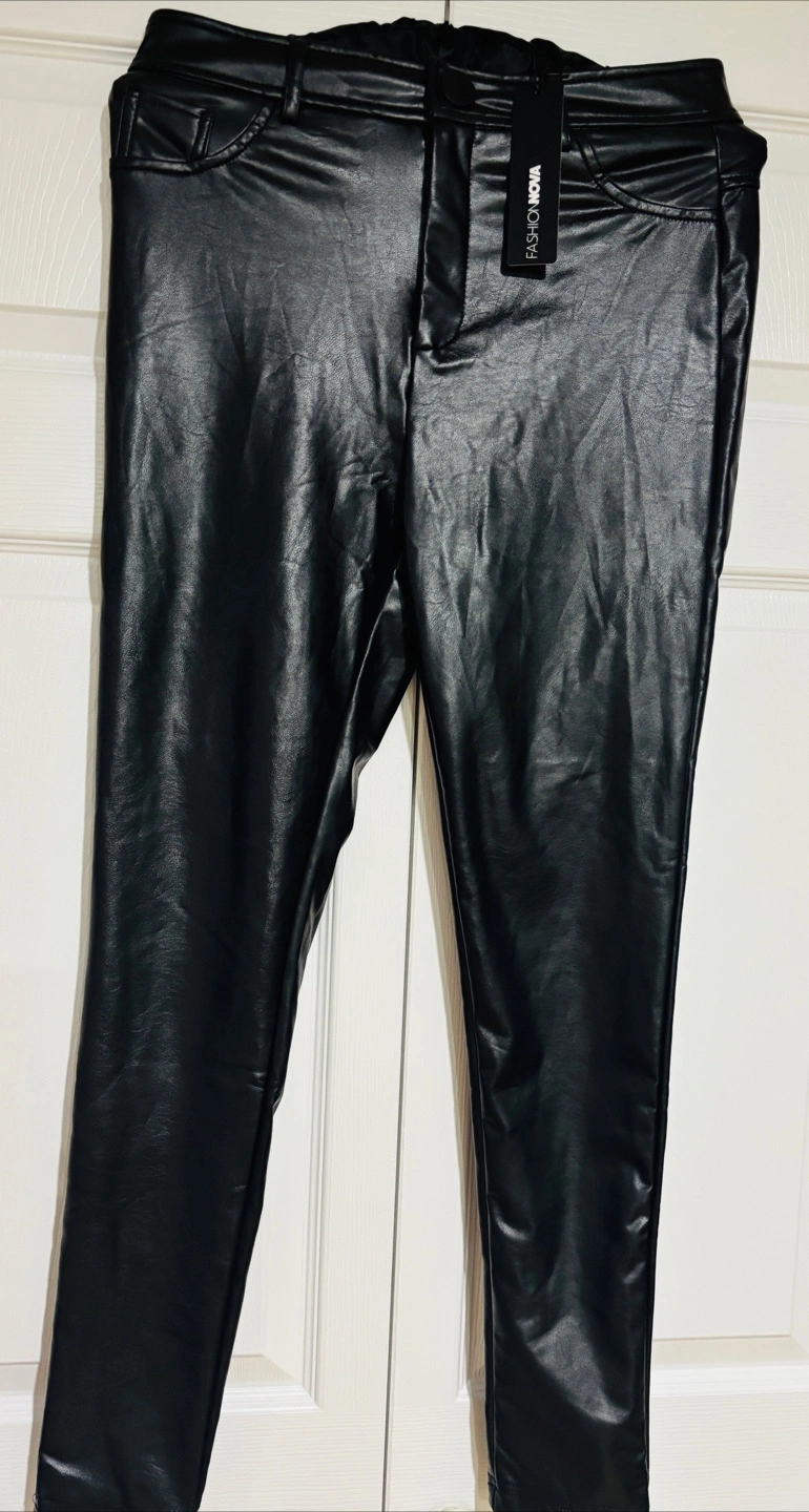 25Selling a pair of Fashion Nova faux leather pants in black, size medium. These pants are in new condition with tags still attached!