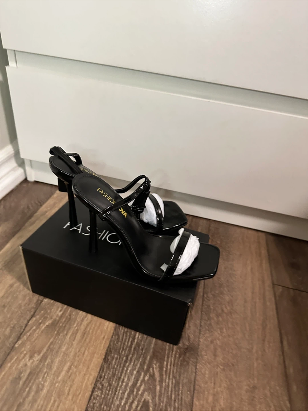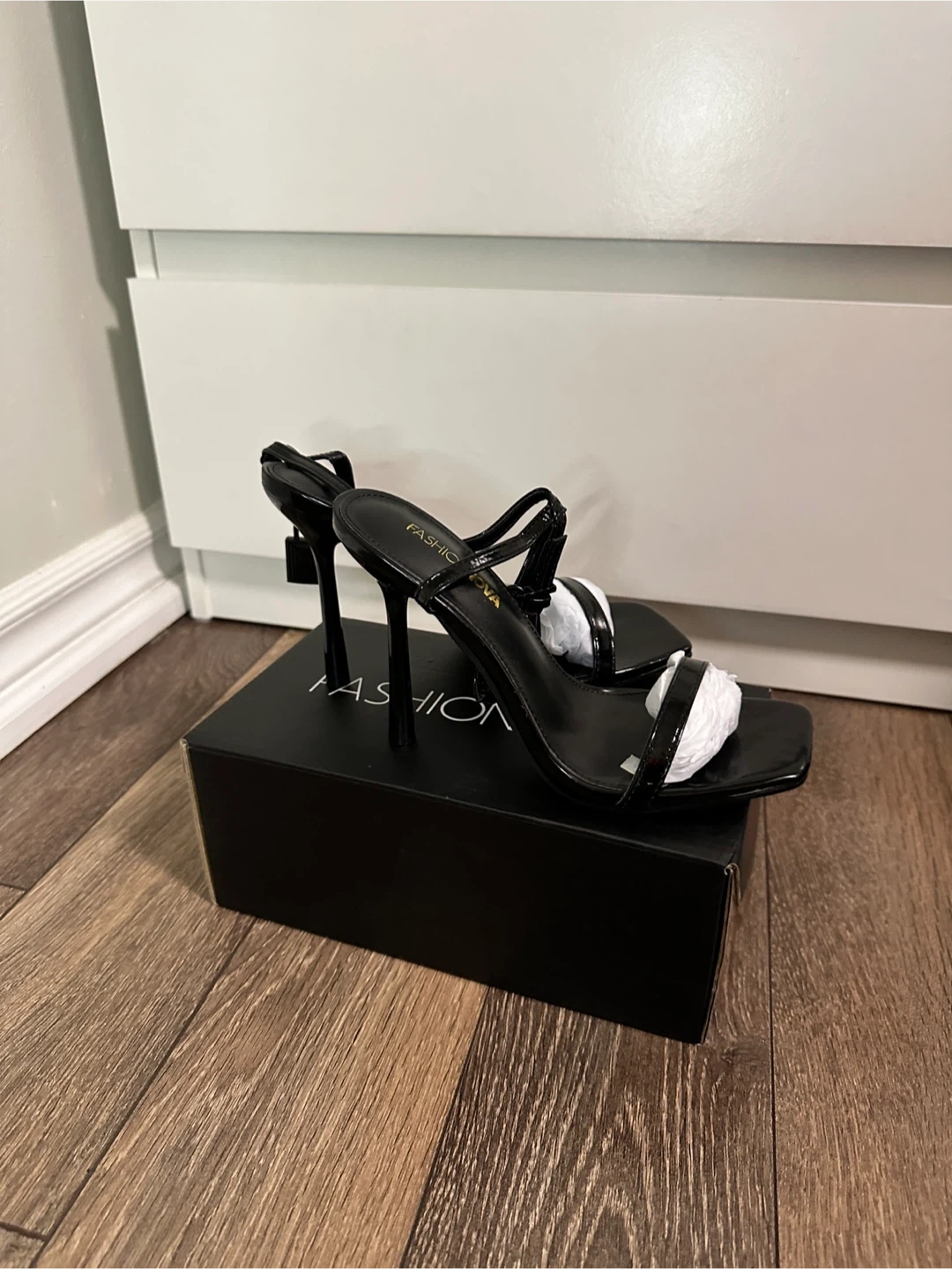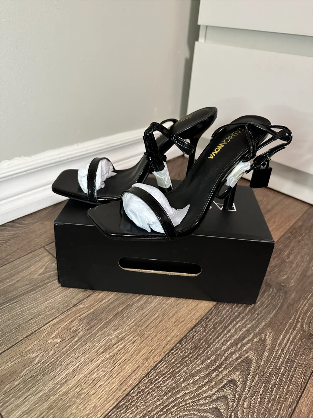These Fashion Nova black heels are brand new and come in their original box! They feature a sleek, minimalist design with a stiletto heel and delicate straps. Perfect for dressing up any outfit! They’re just too tight for my feet. That’s why I’m selling them.