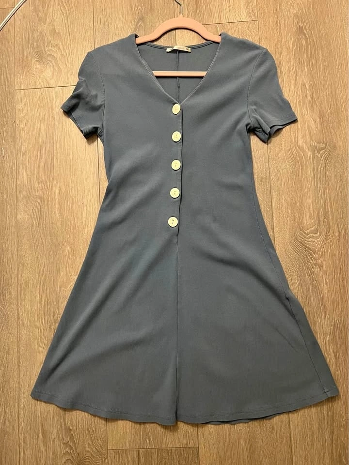 Cute and casual slate blue short-sleeve mini dress. Features a flattering V-neckline, a soft ribbed texture, and decorative large buttons down the front. Easy to throw on with sneakers or sandals for spring and summer! Pick up only near Don Mills Station or Finch Station.