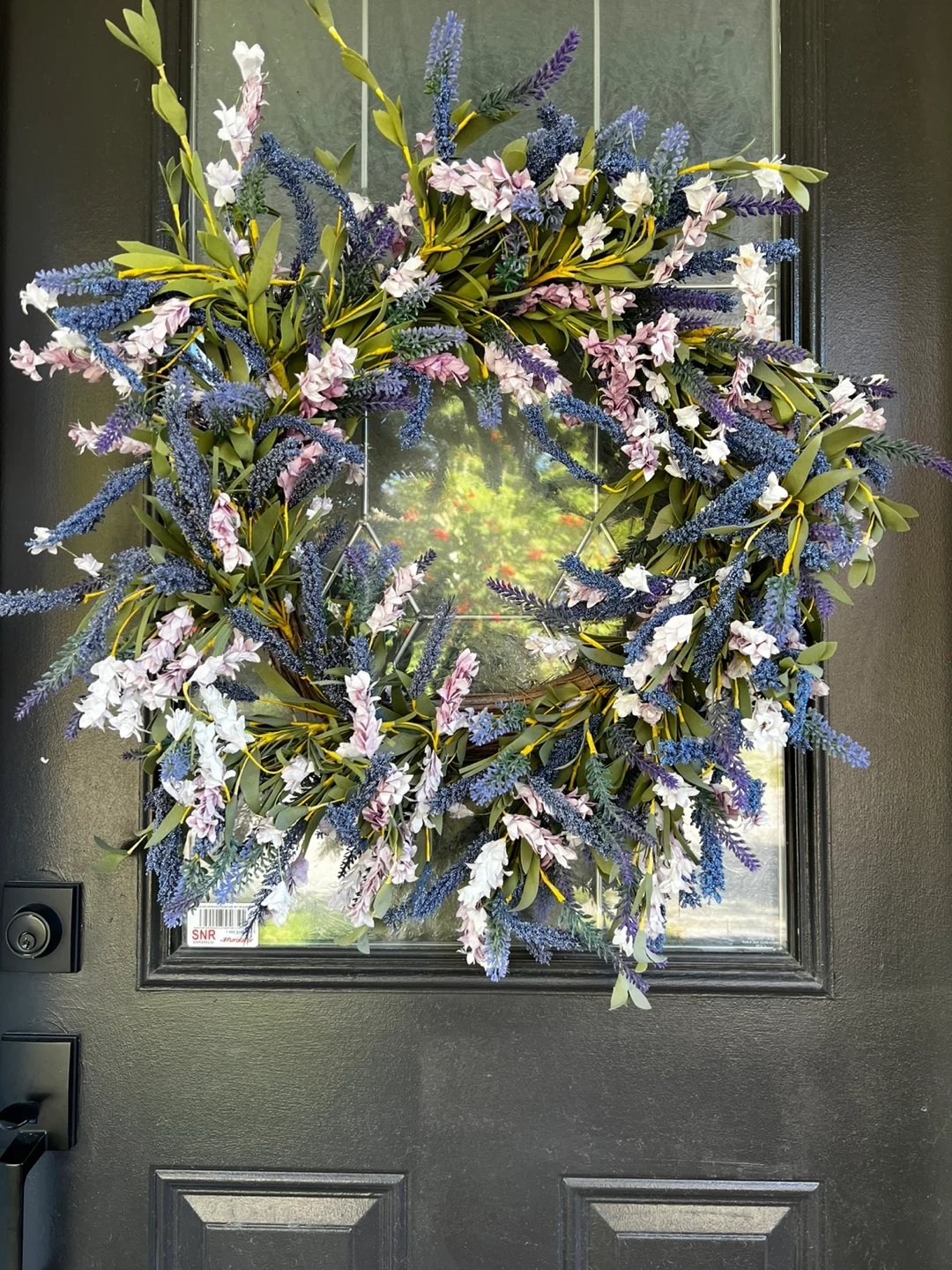 Selling a beautiful floral wreath, perfect for adding a touch of fall to your front door. The wreath features a mix of lavender and white flowers, creating a lovely and inviting display