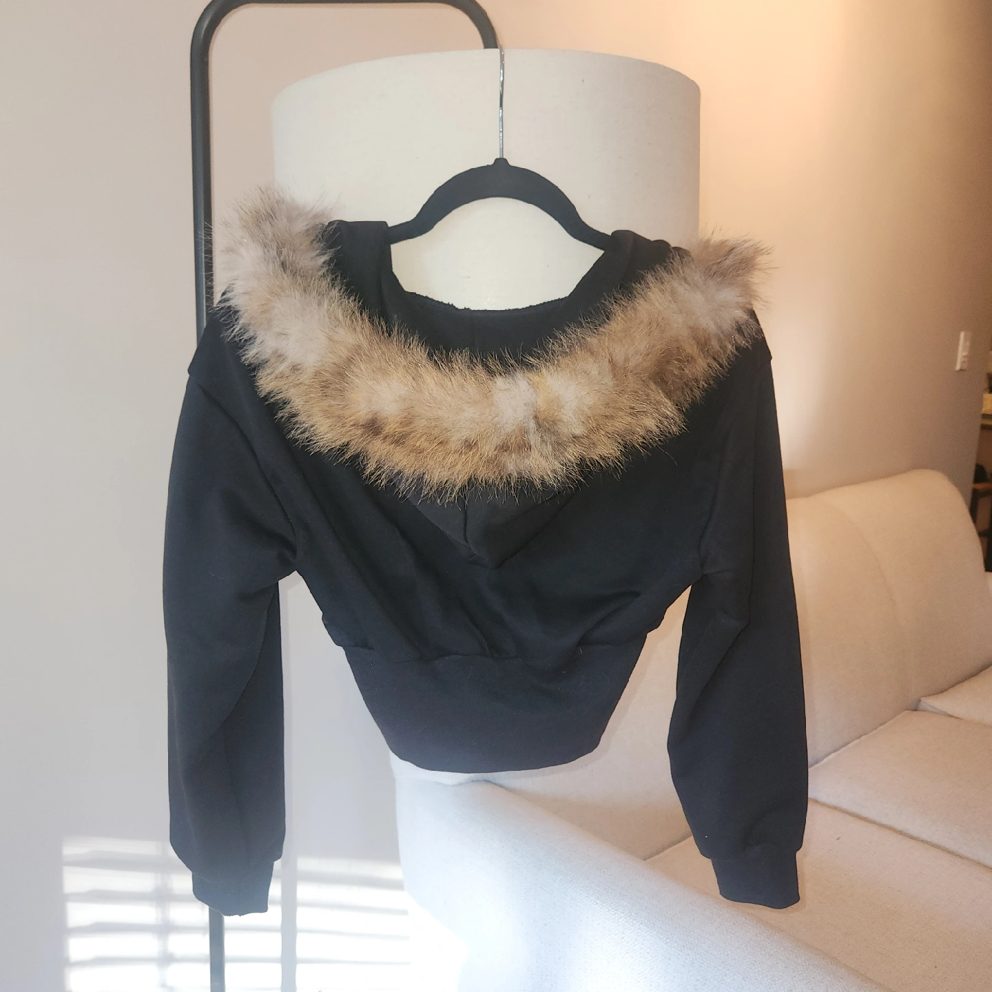 10Selling a cute faux fur cropped zip hoodie in black. Size small, in great condition and features a cropped design and a cozy hood. Only been worn once or twice. Perfect for layering or wearing on its own!