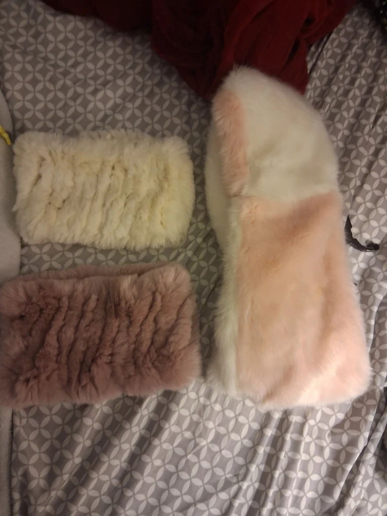 26Selling a set of faux fur accessories! There are two headbands in cream and rose, plus earmuffs in a lovely pink and white combo. They're in great condition and super soft, perfect for keeping cozy this winter ea is 10!