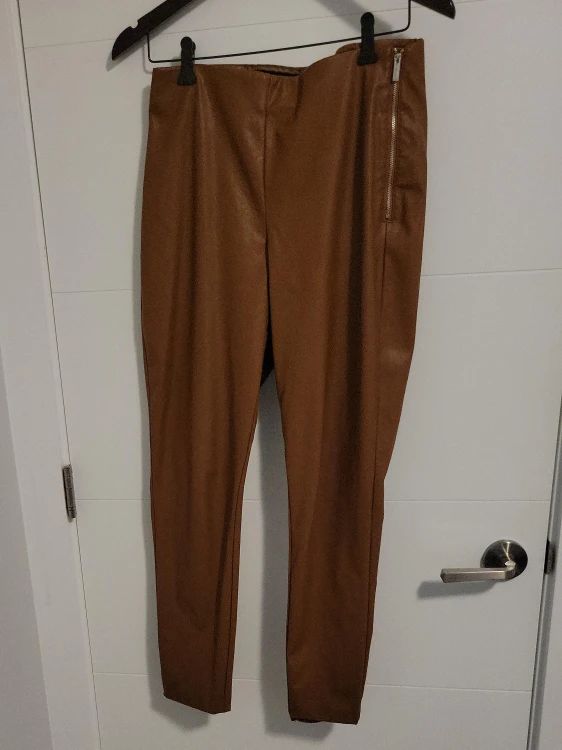 65Here are some stylish faux leather Calvin Klein pants in a lovely brown colour! They're perfect for adding a bit of edge to your wardrobe. They appear to be in great condition and ready for a new home!