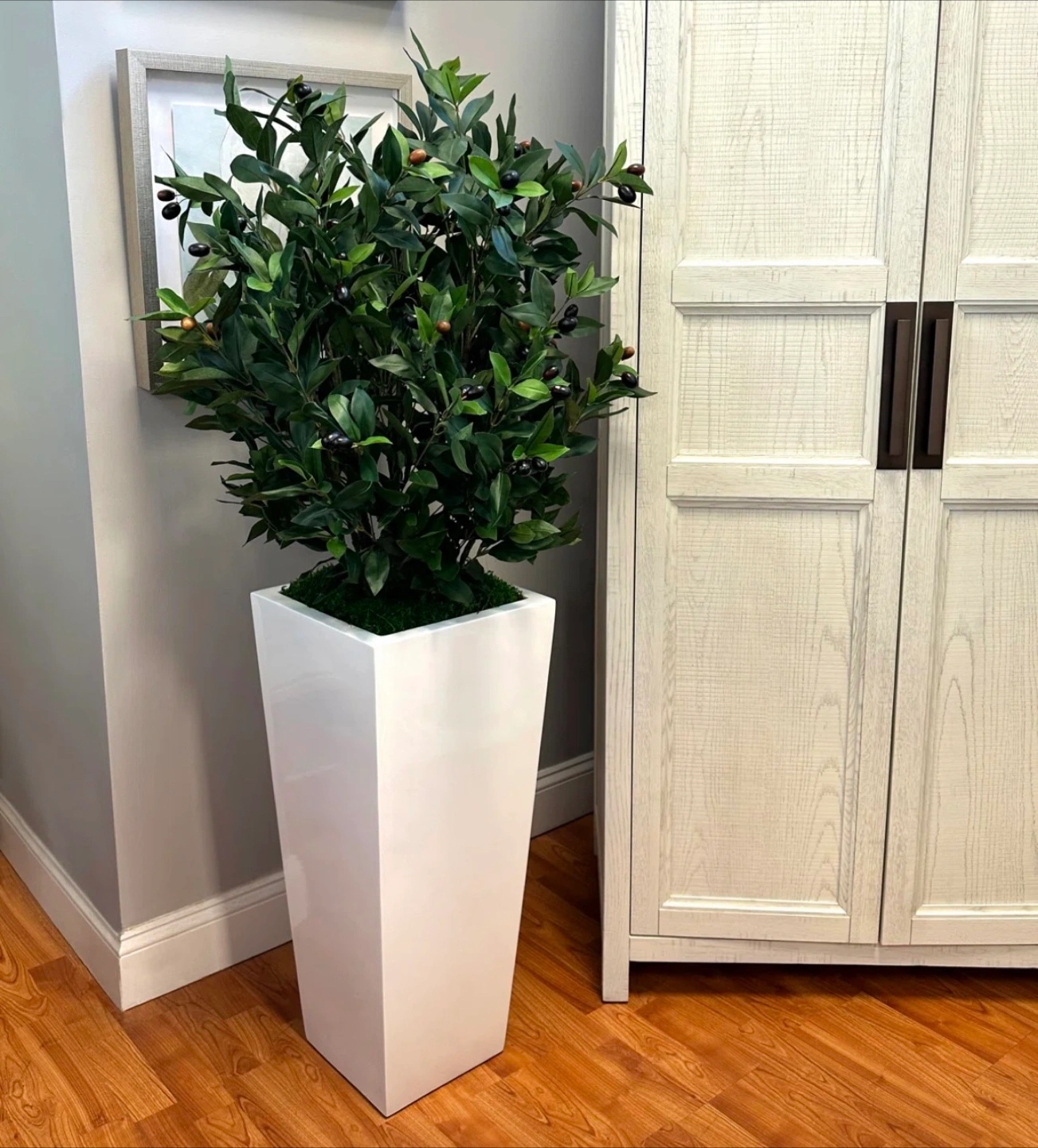 20Elevate your living space with this nearly new faux olive tree, standing at 62 inches tall and potted in a sleek, modern white fiberstone planter. This elegant artificial plant brings a touch of Mediterranean charm to any room without the upkeep of a real tree. Specifications: * Height: 62 inches * Planter: White fiberstone * Condition: Nearly new Looking to add a touch of greenery without the hassle? This faux olive tree is the perfect solution. It's so realistic, your guests might just ask when you harvested your first olives! But don't delay, because if the ad is up, it's available! Wayfair purchase $329.99+tax