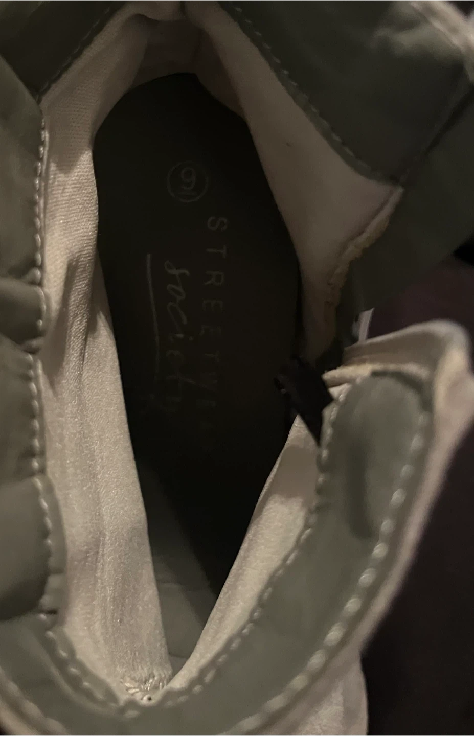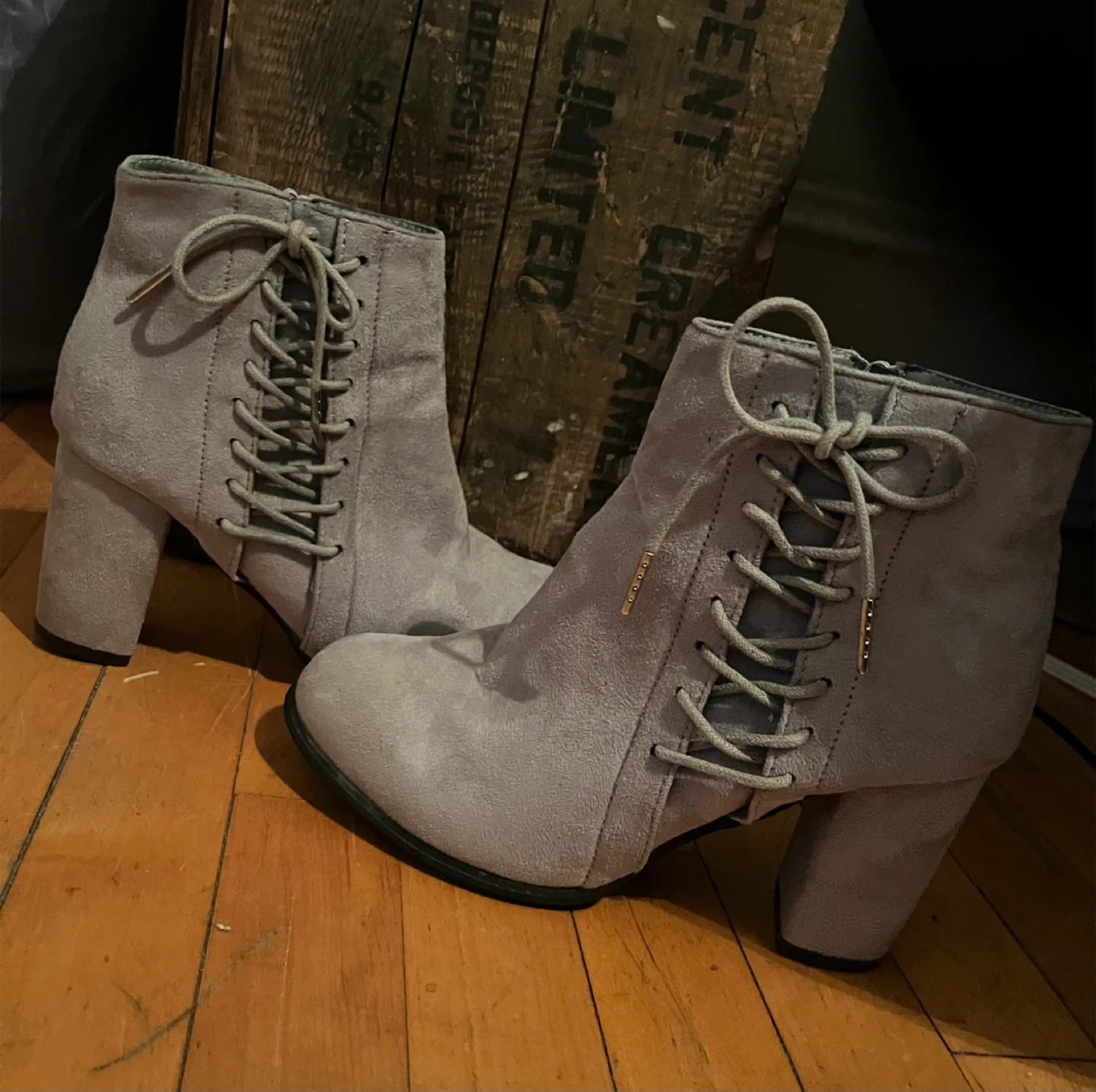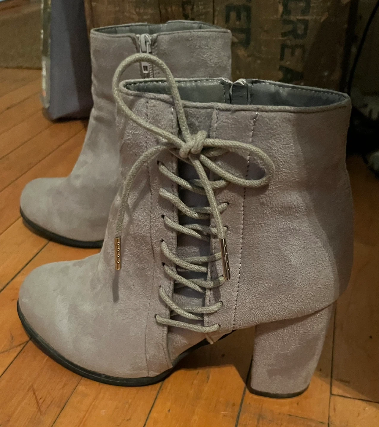 Grey Faux suede block heel with lace-up side also with a zipper on the other side for easy wear Women’s Size 9 Cash only please
