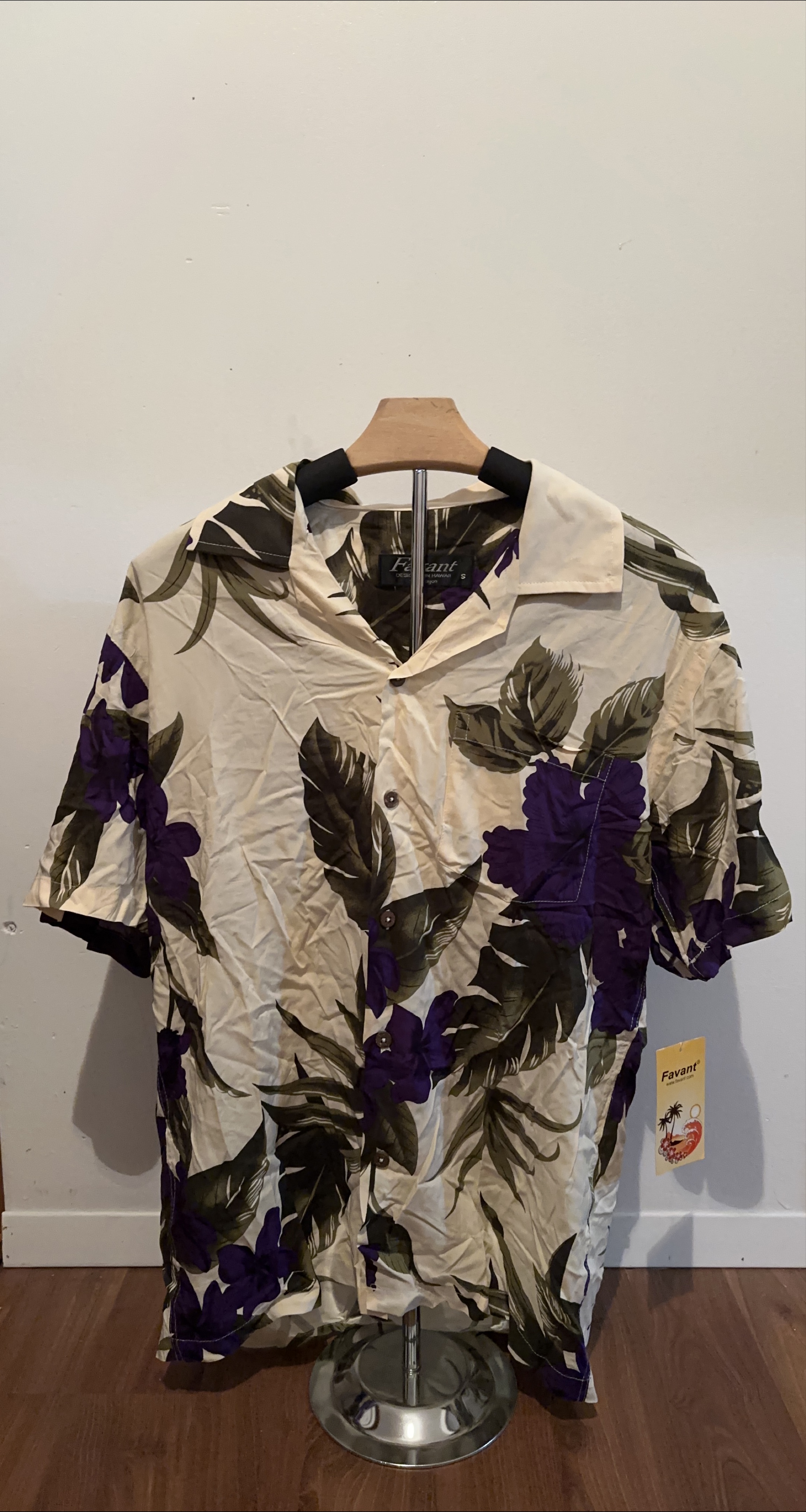 Selling a Favant Hawaiian shirt in size small. It features a beautiful floral pattern with purple flowers and green leaves on a cream background. Perfect for summer!
