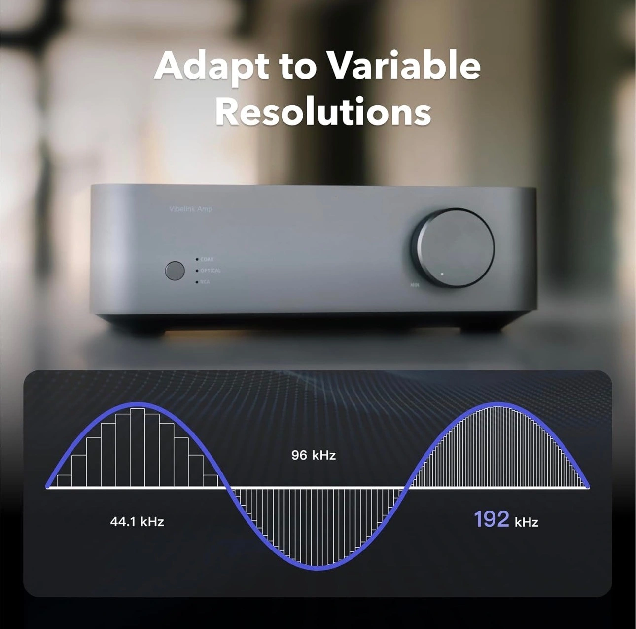 True High-Resolution Playback - Unlike standard amps, the WiiM Vibelink Amp supports variable sample rates and bit depths, preserving lossless, high-fidelity sound for streaming, FLAC, and vinyl rips. Enjoy bit-perfect 192kHz/24-bit playback via Optical and Coax inputs with zero signal loss.