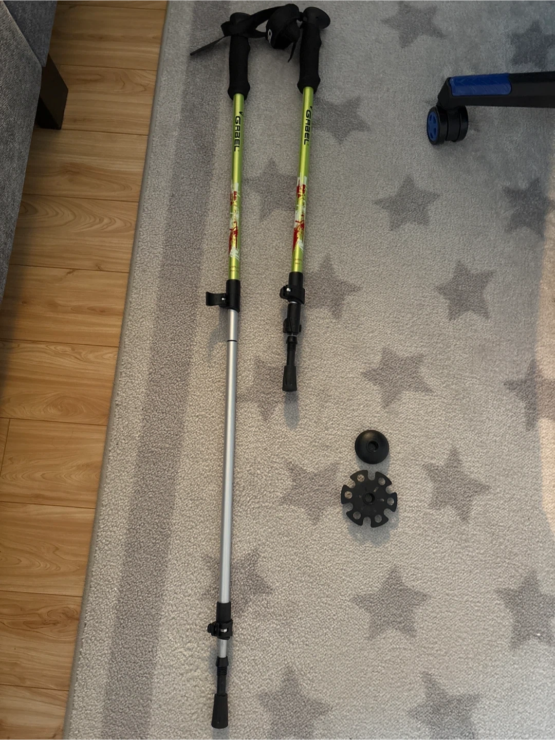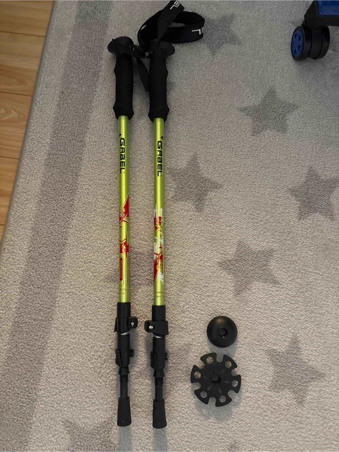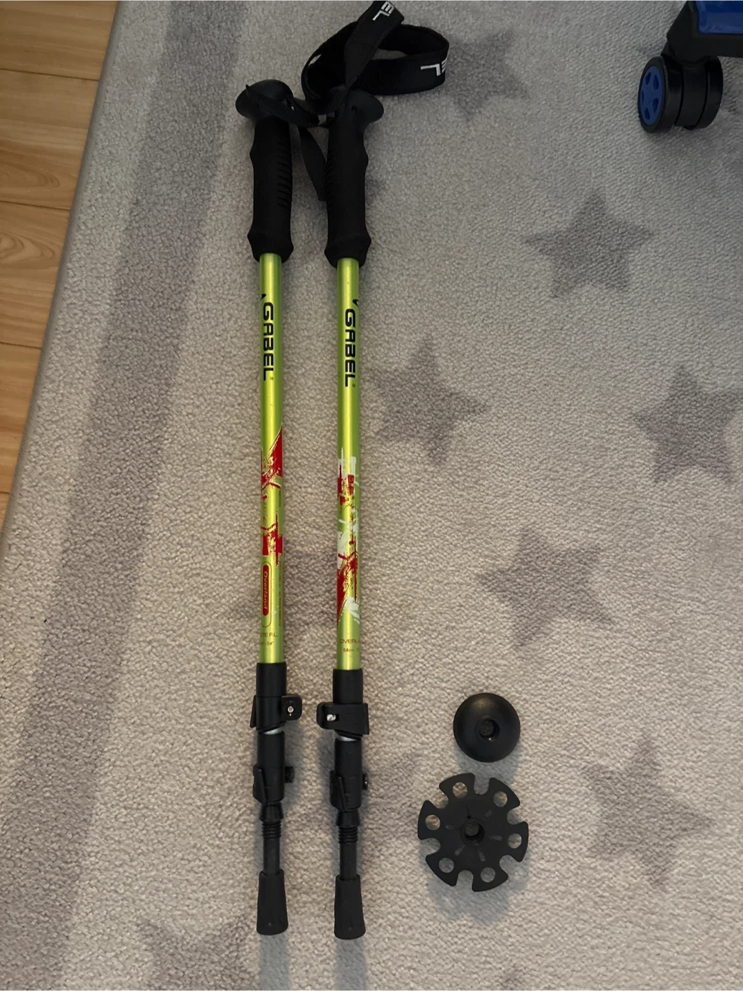 Pair of Gabel trekking poles with adjustable straps. Includes two sets of interchangeable baskets for different terrains. These poles are great for hiking and snowshoeing adventures!