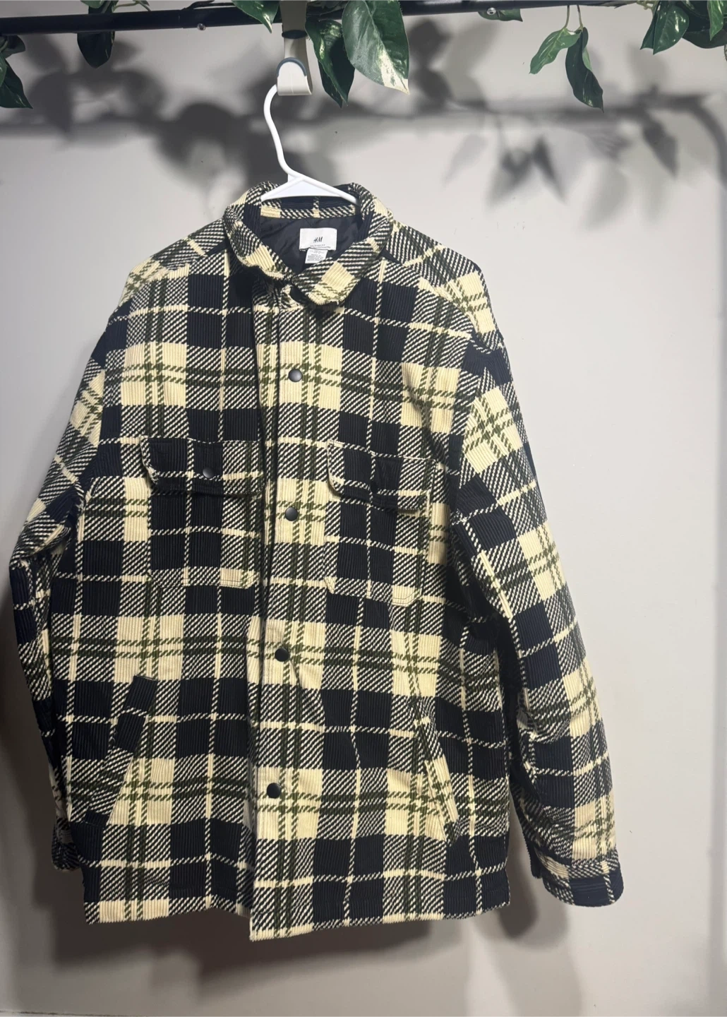 This H&M shacket features a classic plaid pattern in black, cream, and green. It's made from a corduroy material and has button closures. Two chest pockets and side pockets are included.