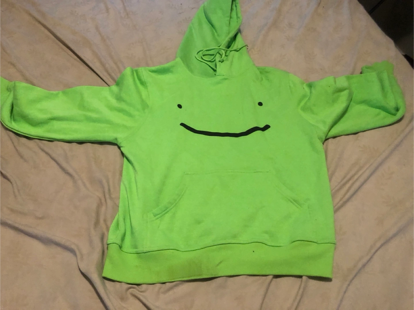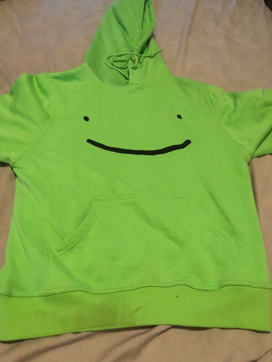 Lime green hoodie. Features a smile on the front. Kangaroo pocket. It would be perfect to wear while relaxing at home.