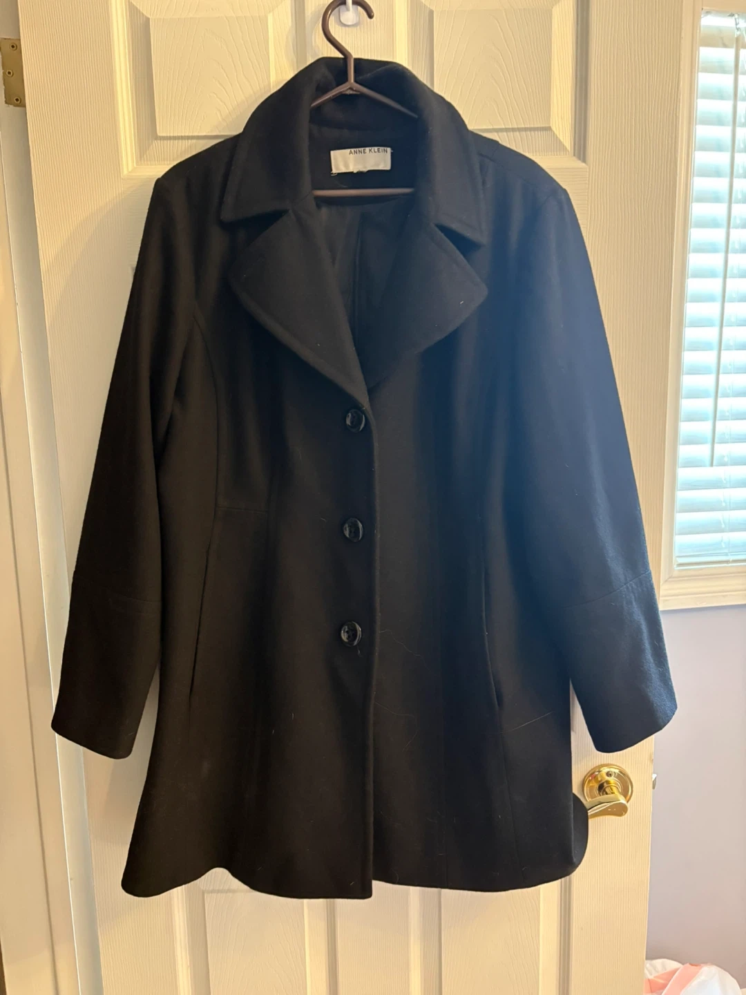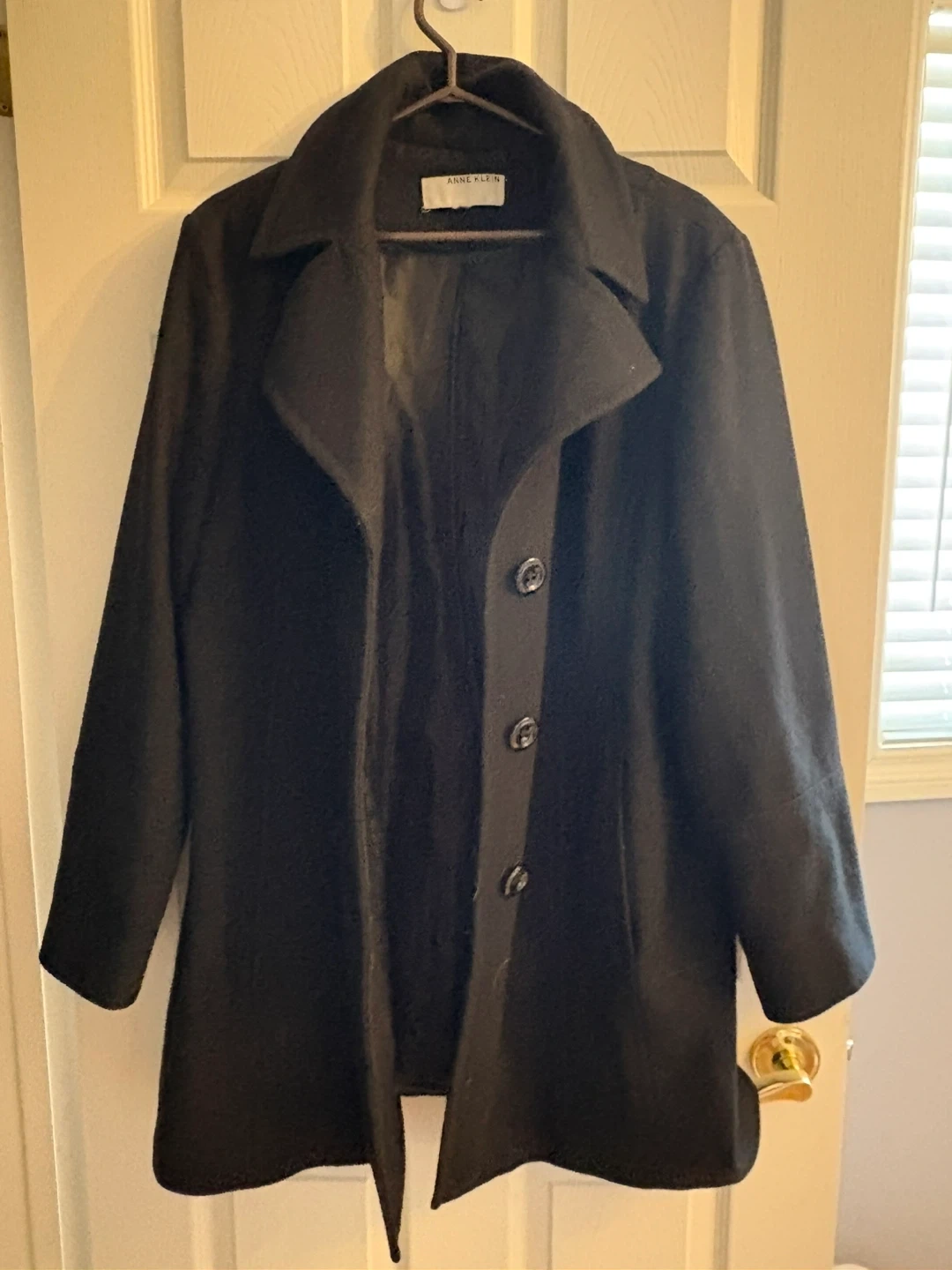 Anne Klein women's black wool blend coat. This stylish coat features a button-up front and a classic collar. It's perfect for cooler weather!