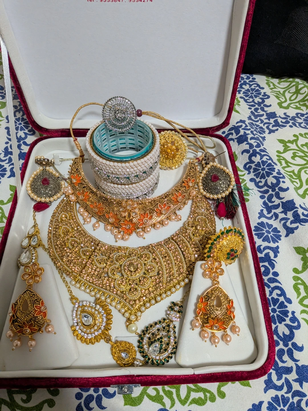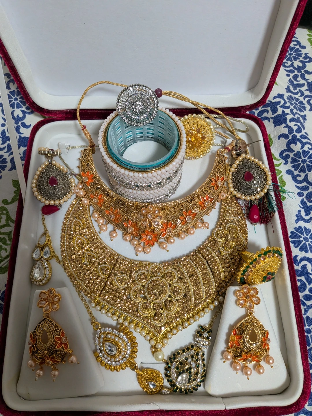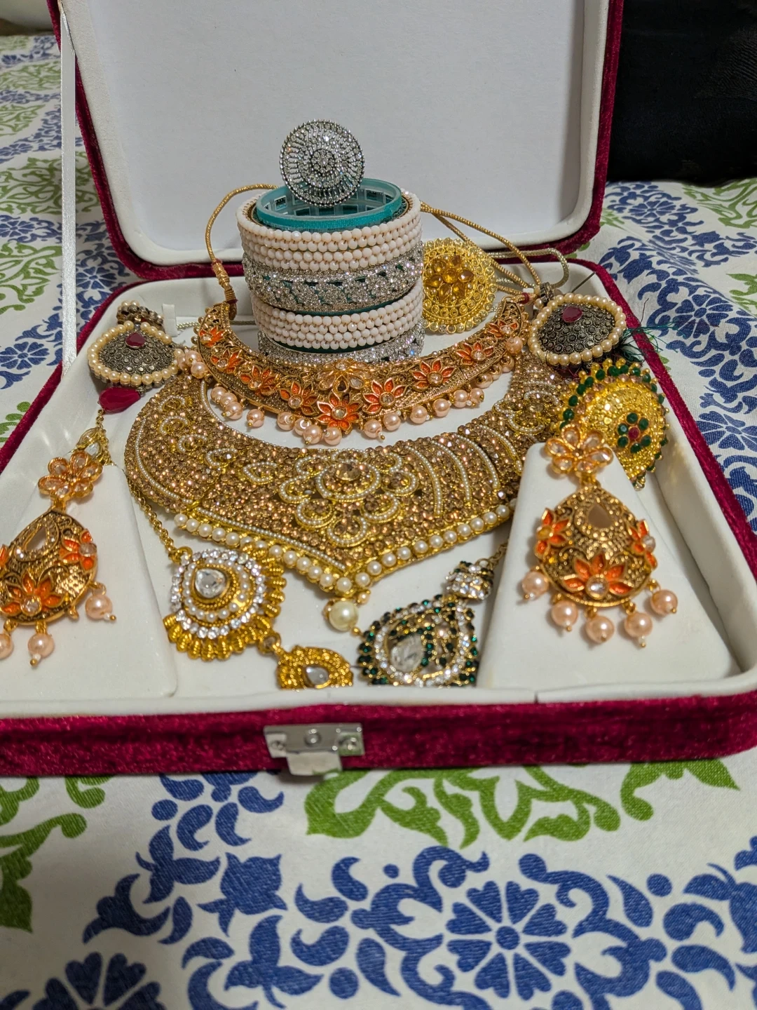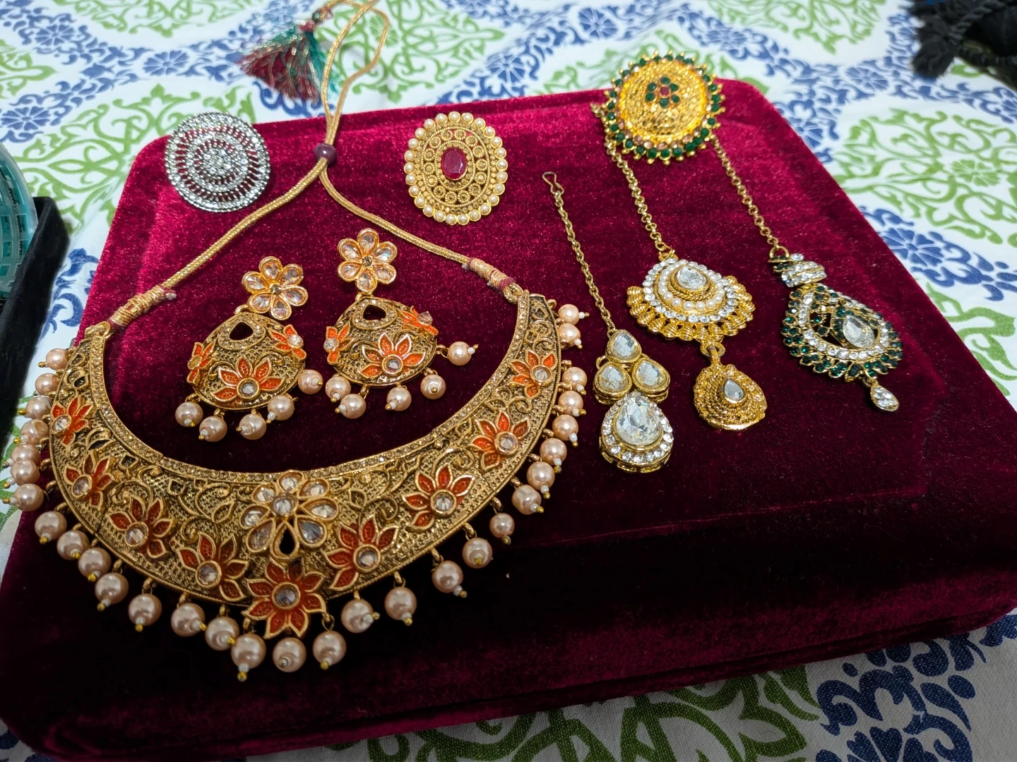 Beautiful Pakistani bridal jewelry sets in excellent condition! These sets include necklaces, earrings, rings, and bangles. Perfect for weddings or special occasions!