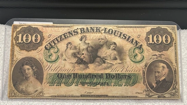 Own a piece of history with this $100 banknote from the Citizens' Bank of Louisiana, dating back to between 1857 and 1899. This piece is in very good condition with great detail and colour. It's a tangible link to the past and would make a fascinating addition to any collection. This note is like a piece of art for display in your home. If the ad is up, it's still available. Cash accepted, Cashless payment accepted.