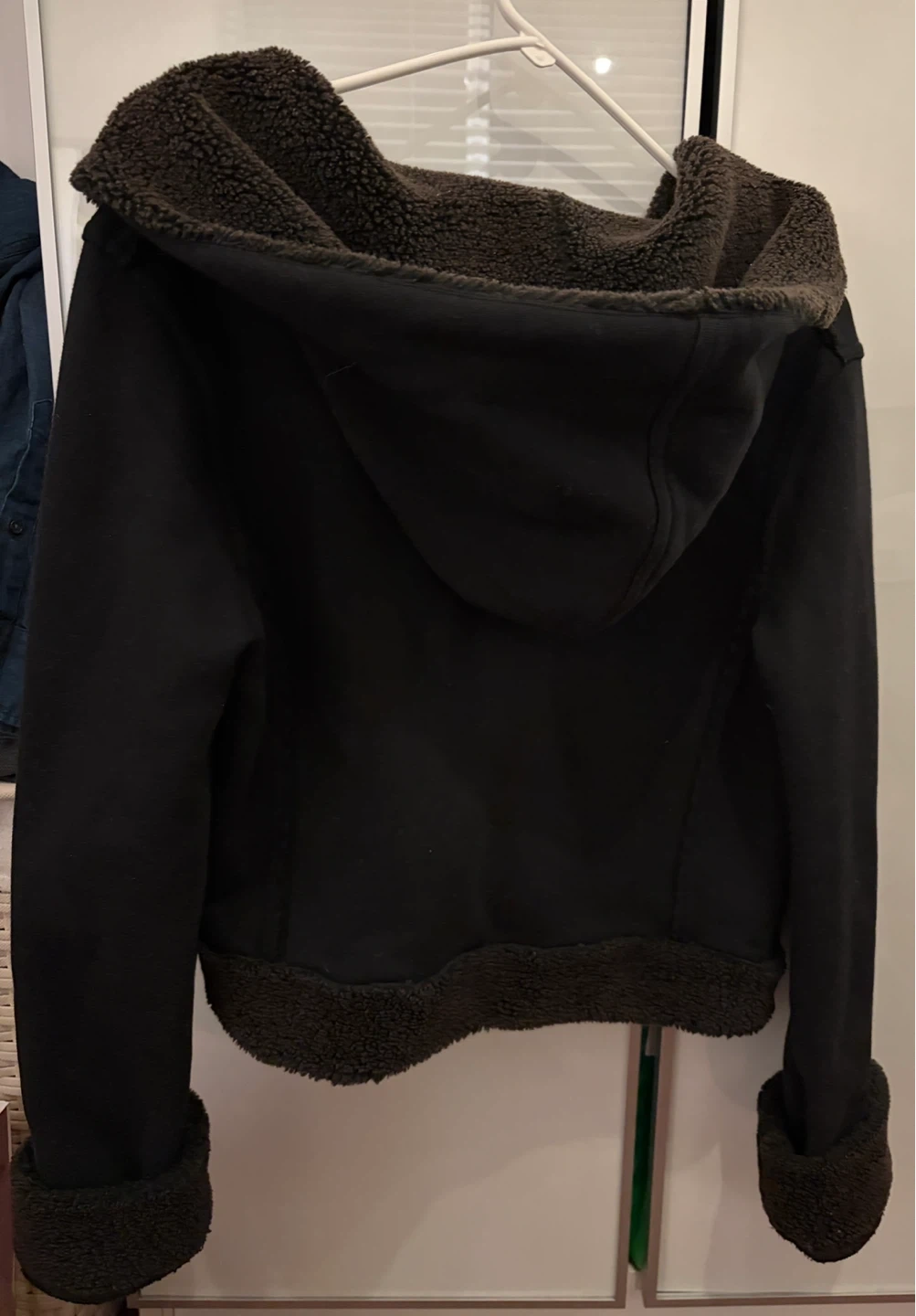 Selling my mom’s black hooded jacket in a size medium (fits more like a small) that was bought in Hong Kong. It's black with a soft, brown furry lining. Perfect for chilly weather!