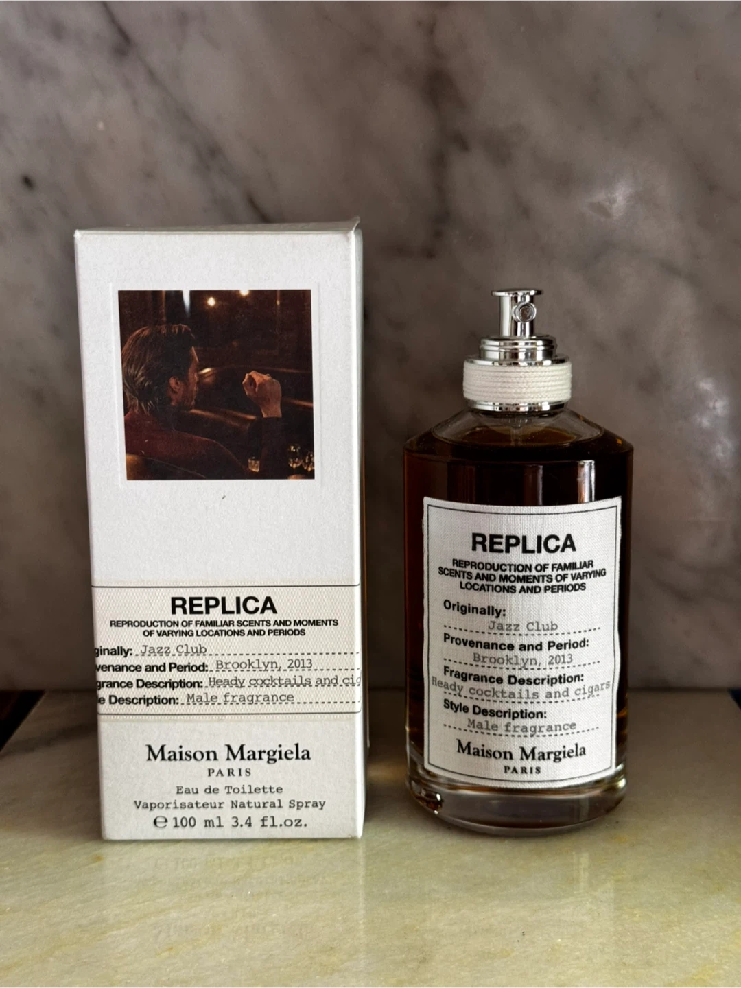 Maison Margiela REPLICA Jazz Club Eau de Toilette. "Heady cocktails and cigars" inspired fragrance. Male fragrance. 100 ml 3.4 fl.oz. Made in France. Retails for $170