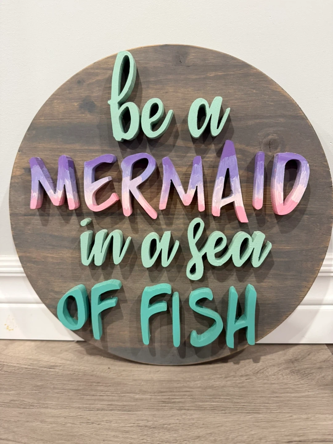Decorative wooden sign with raised lettering. Features a motivational quote about embracing individuality. The circular wood base has a dark stain, and the letters are painted in a gradient of teal, pink, and purple. This piece adds a whimsical touch to any room!