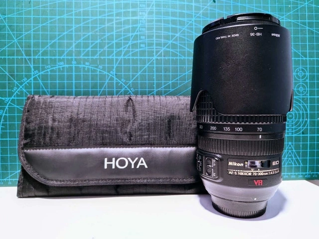 Selling a few years old Nikon 70-300 AF-S f/4.5-5.6 G VR FX F Mount camera lens with a Hoya Pro 1 UV(0) protection filter. Lens glass has been cared for so the glass is scratch free, but the hood caps and lens may have a few signs - none affected performance. Hoya filters set includes: Hoya 67 mm CPL Hoya 67 mm Warm Hoia 67 mm UV Hoya 4 slot carry pouch. See photos for more details. Thanks