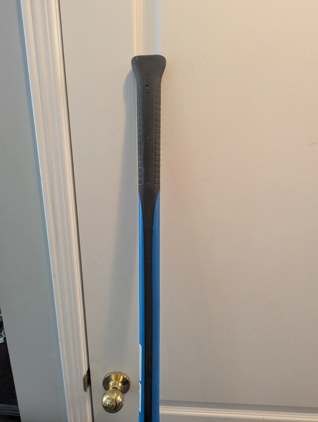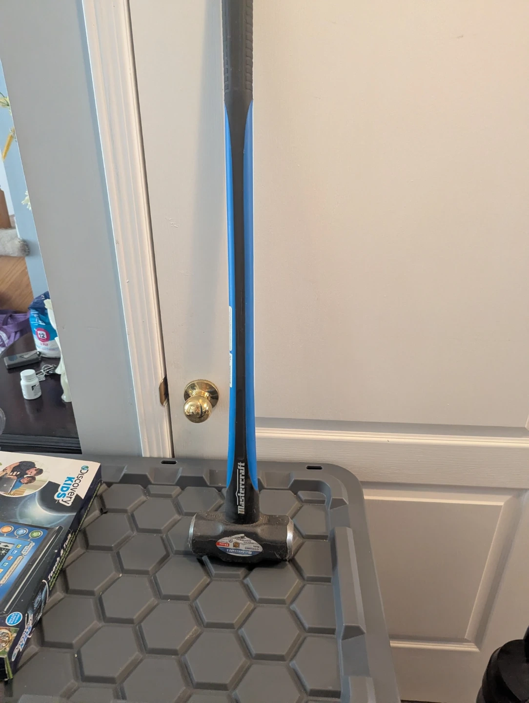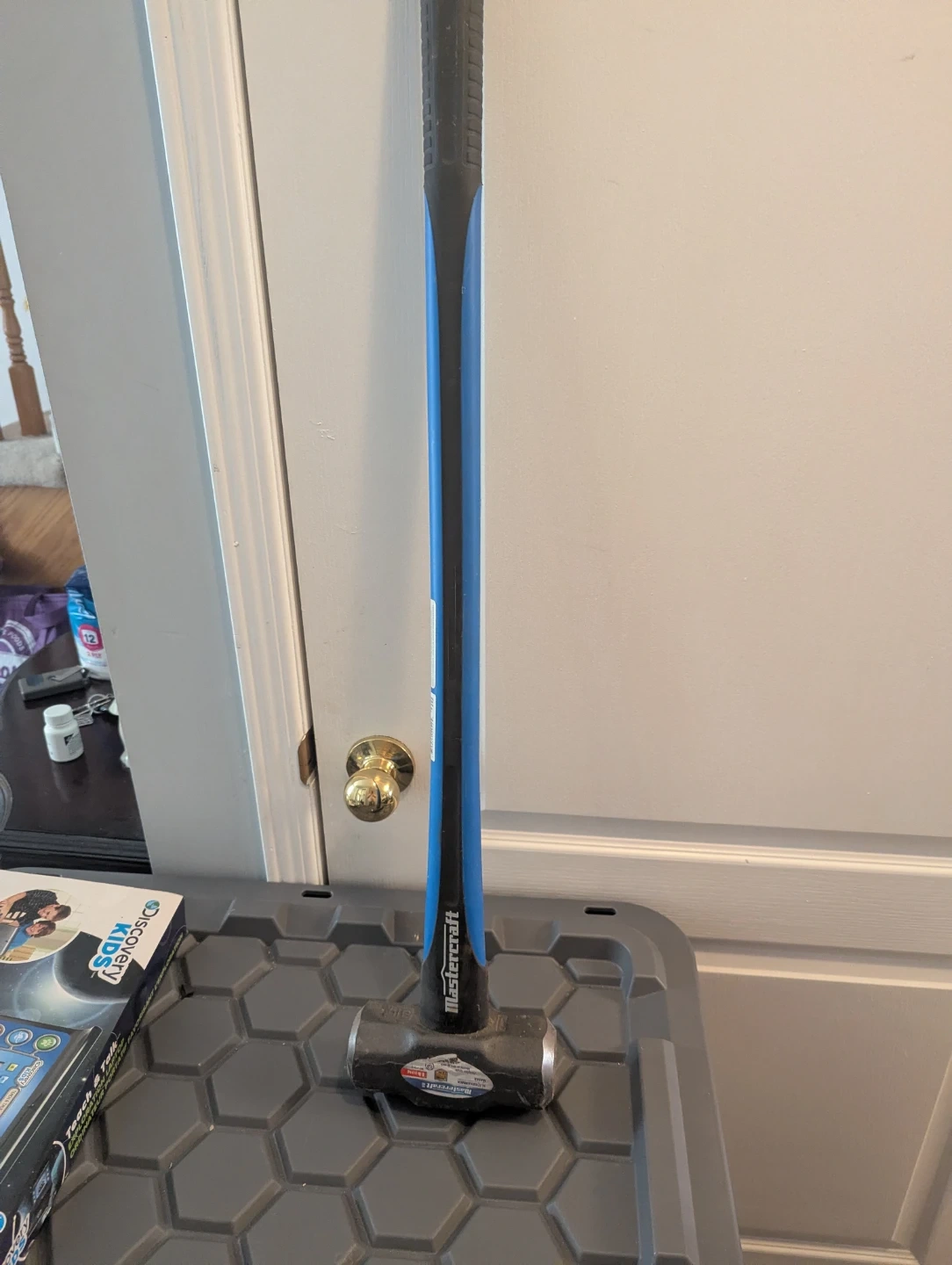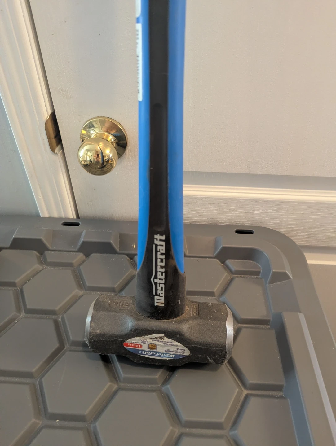Mastercraft sledgehammer with a blue and black handle. It's got a substantial head for heavy-duty tasks. Useful for demolition or breaking tough materials.