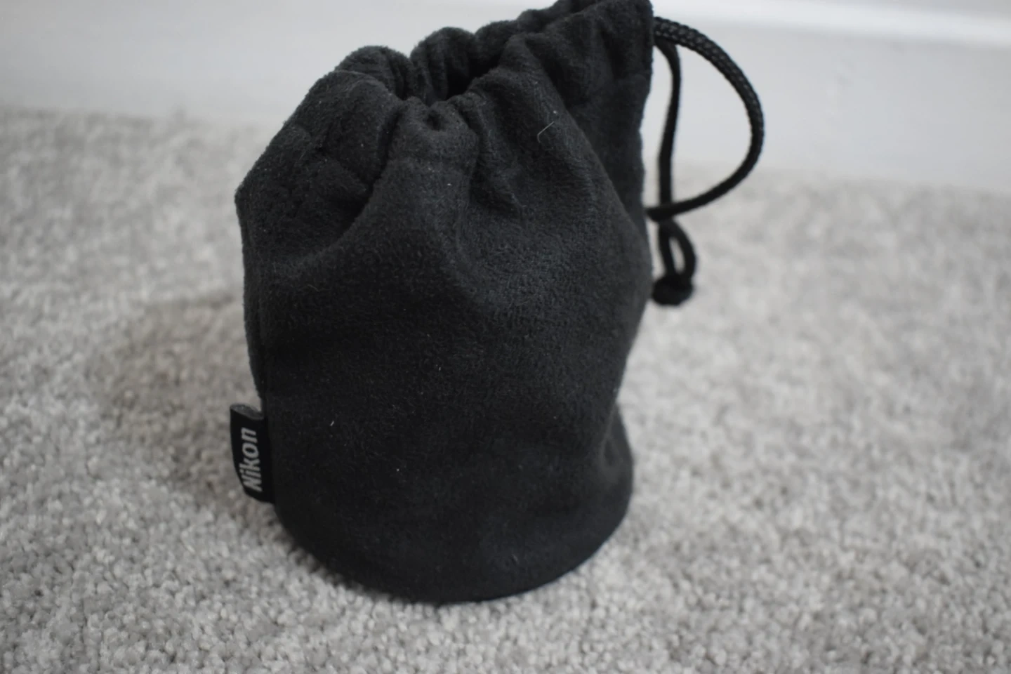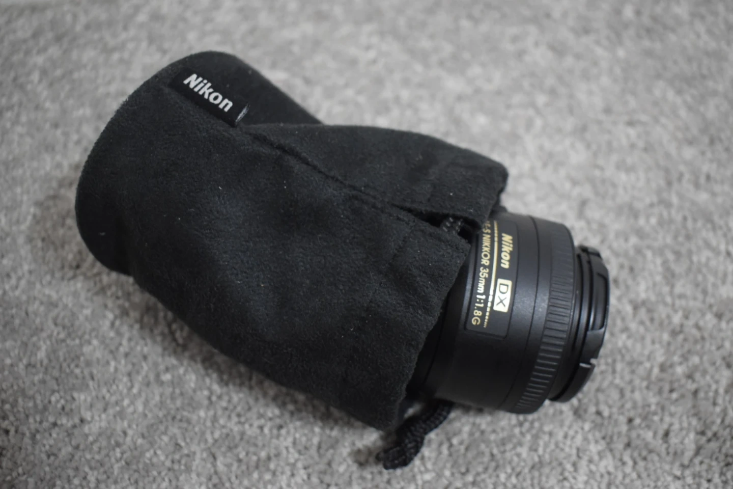 This is a Nikon AF-S NIKKOR 35mm 1:1.8G DX lens. It's a prime lens with a wide aperture. Includes lens cap and pouch.