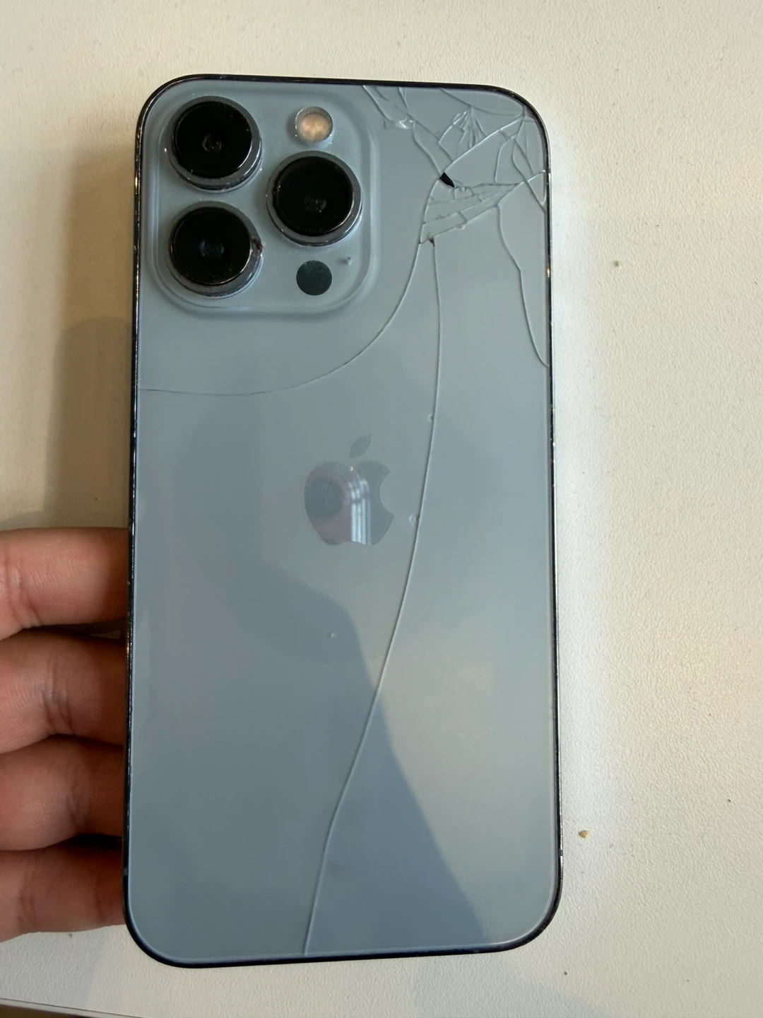 iPhone 13 Pro in Sierra Blue with cracked back glass. Battery health is at 93% maximum capacity. It's unable to verify the authenticity of the Apple battery. Some cosmetic wear is present.