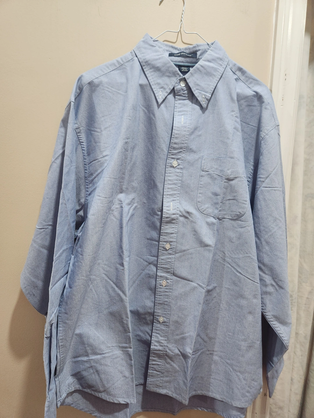 Light blue long-sleeve button-down shirt. Features a chest pocket. Good for casual wear.
