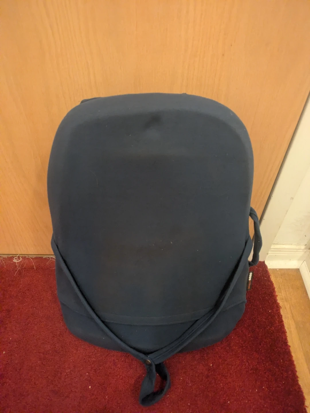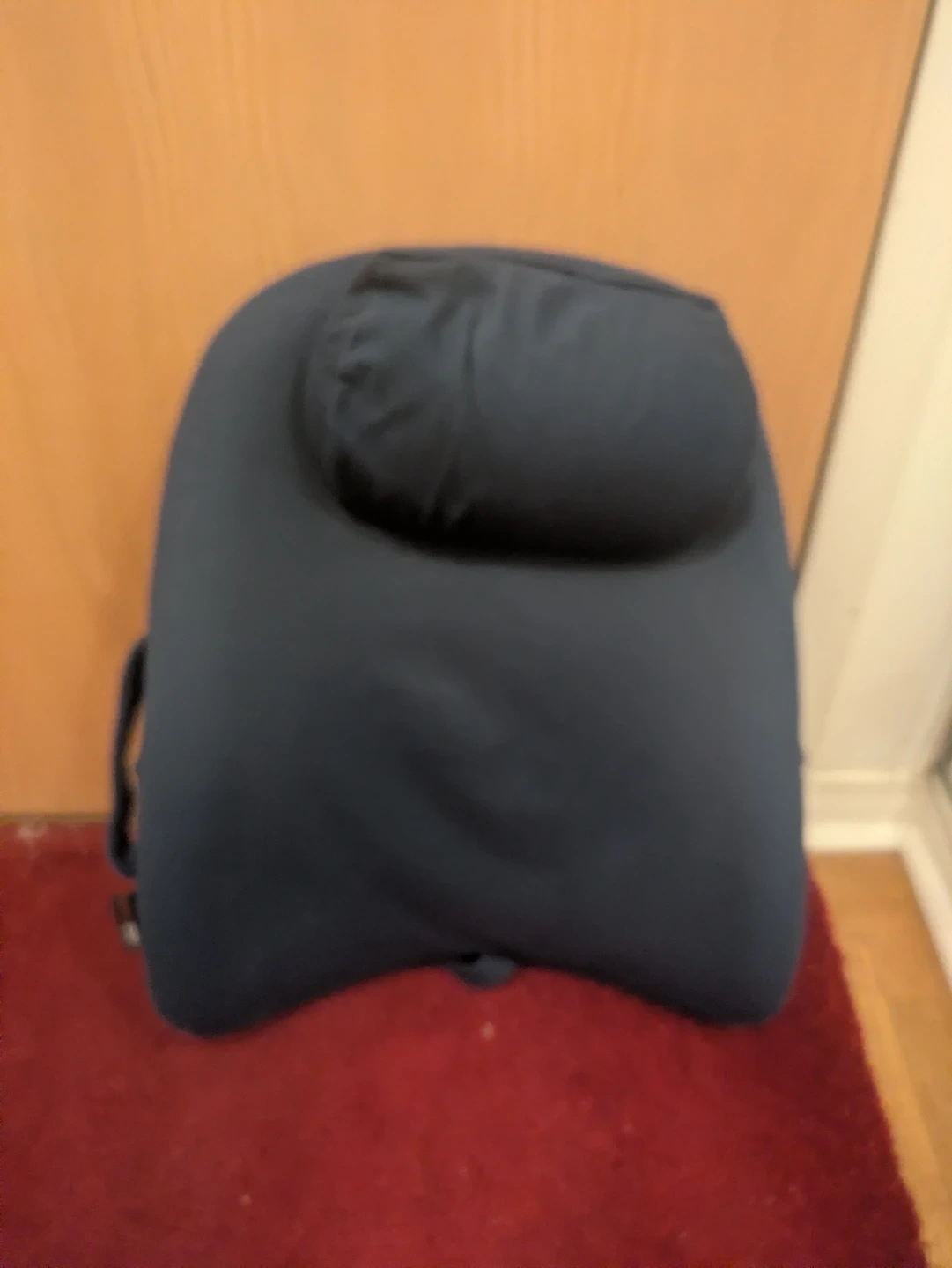 This is a dark blue lumbar support cushion. It's designed to provide comfort and support for your back. Straps are included for securing it to a chair.