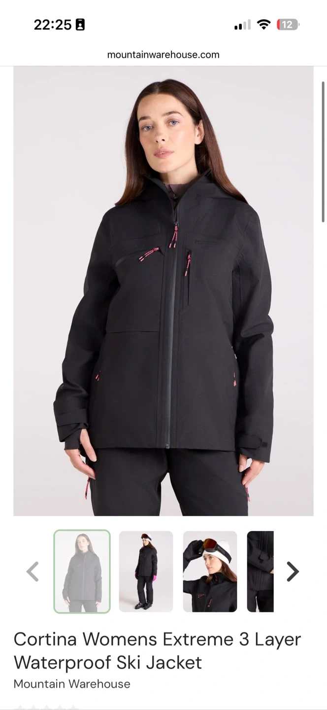This is a Mountain Warehouse Cortina Womens Extreme 3 Layer waterproof ski jacket. It's designed for skiing and outdoor activities. Its waterproof construction offers protection from the elements.