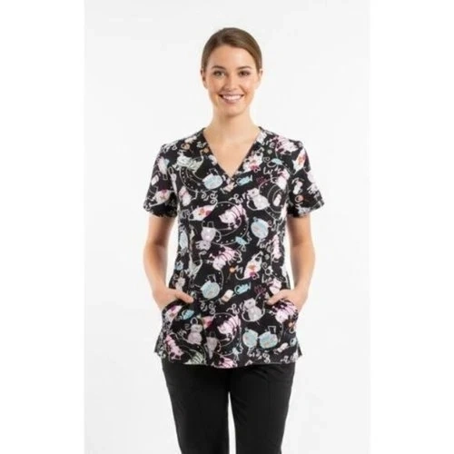 White Cross XS black nurse scrubs top shirt blouse black cats pa