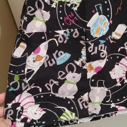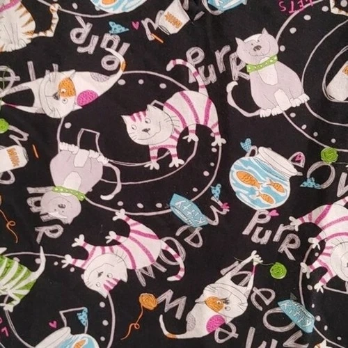 Short sleeve Cats, purr, meow, fish, aquarium , play, yarn pattern Black, white Pink, blue, orange, gray, brownCotton XS extra smallTwo large pockets Hint of a 5 way stretch Approx measurements pit to pit 19 in