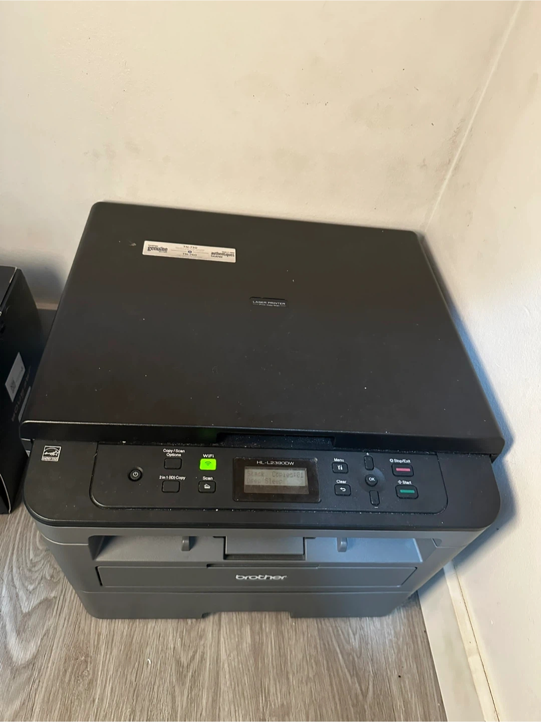 This Brother laser printer is black and it's a monochrome laser printer. It's a compact all-in-one model that prints, copies, and scans. It's got a wireless connection option. This would be useful for a home office or small business printing needs.