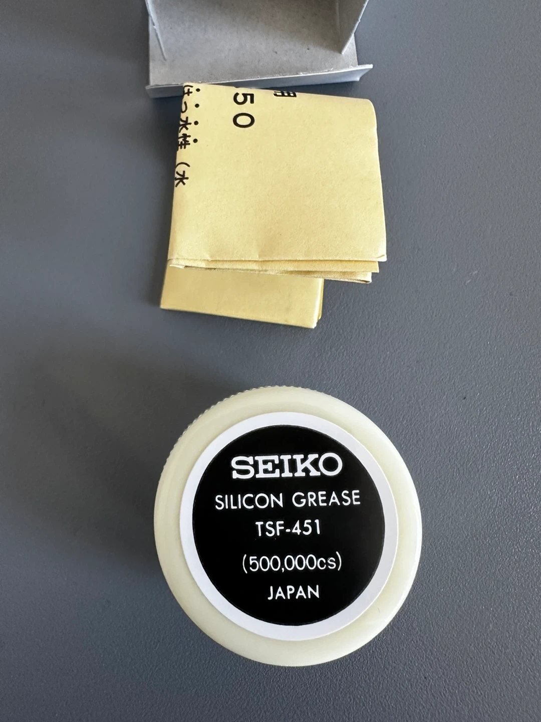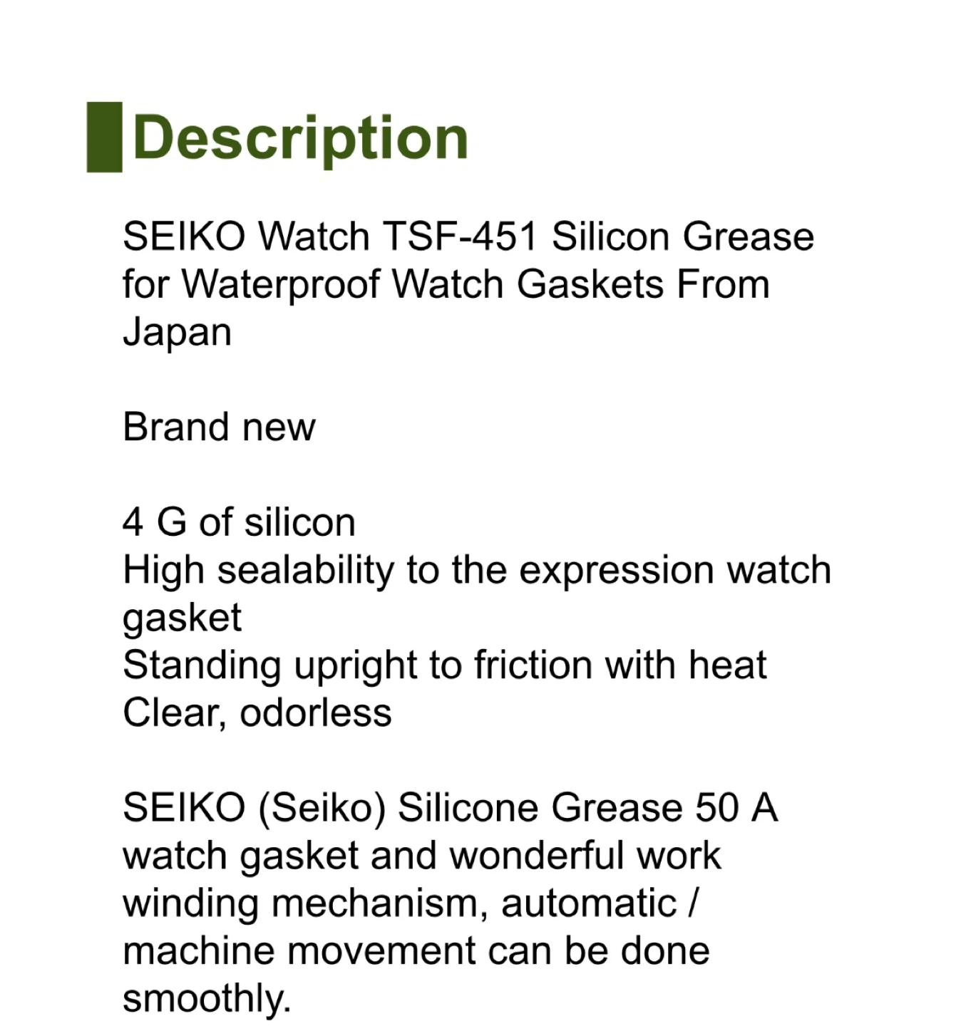 SEIKO watch gasket silicone grease, model TSF-451. It's 4g of clear, odorless silicon grease. High sealability for watch gaskets, withstands friction and heat. Helps automatic and machine movements run smoothly.