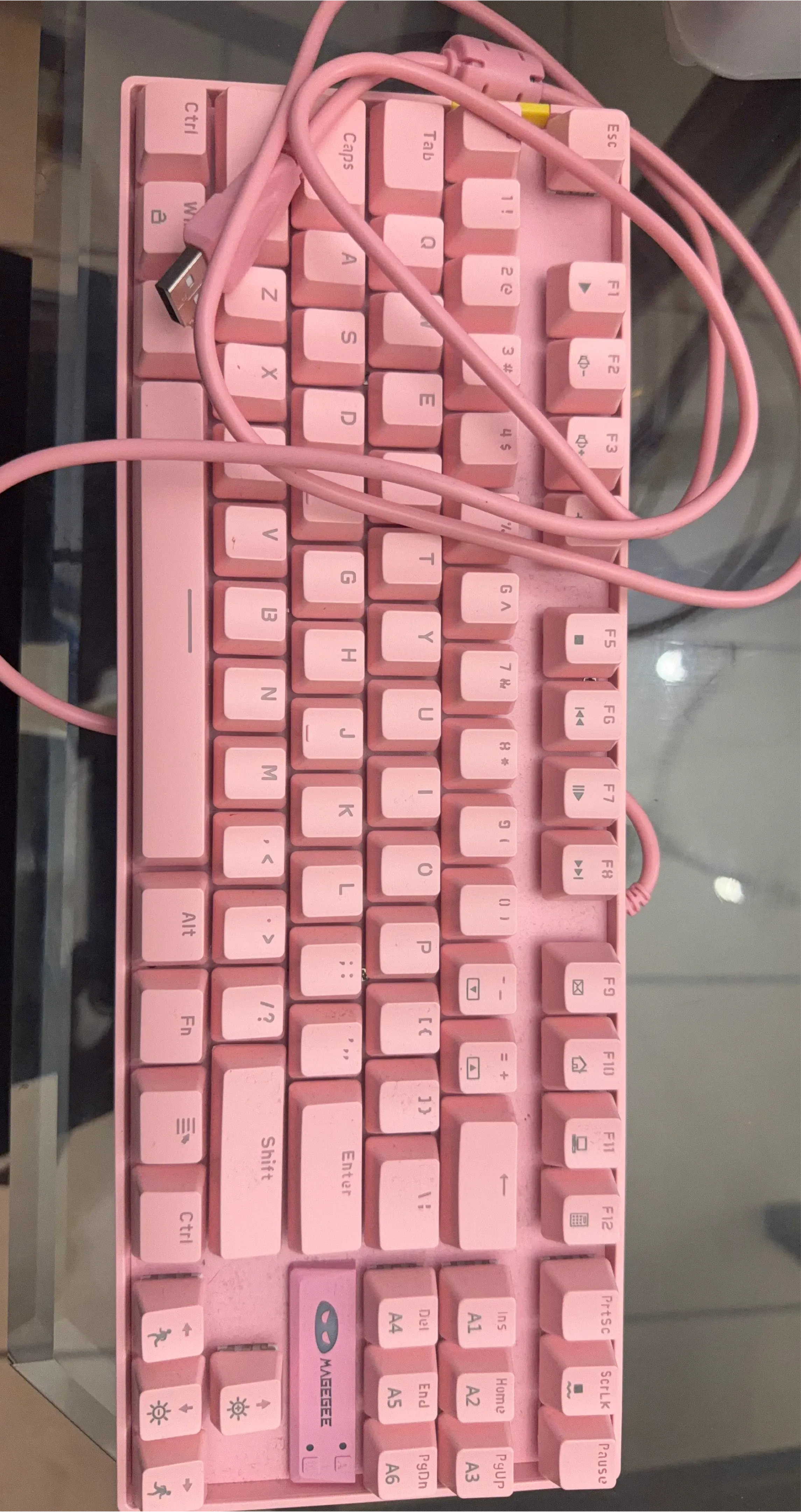 This is a pink MAGEGEE mechanical keyboard. It features a compact design with a detachable USB cable. The keyboard has a QWERTY layout and includes function keys.