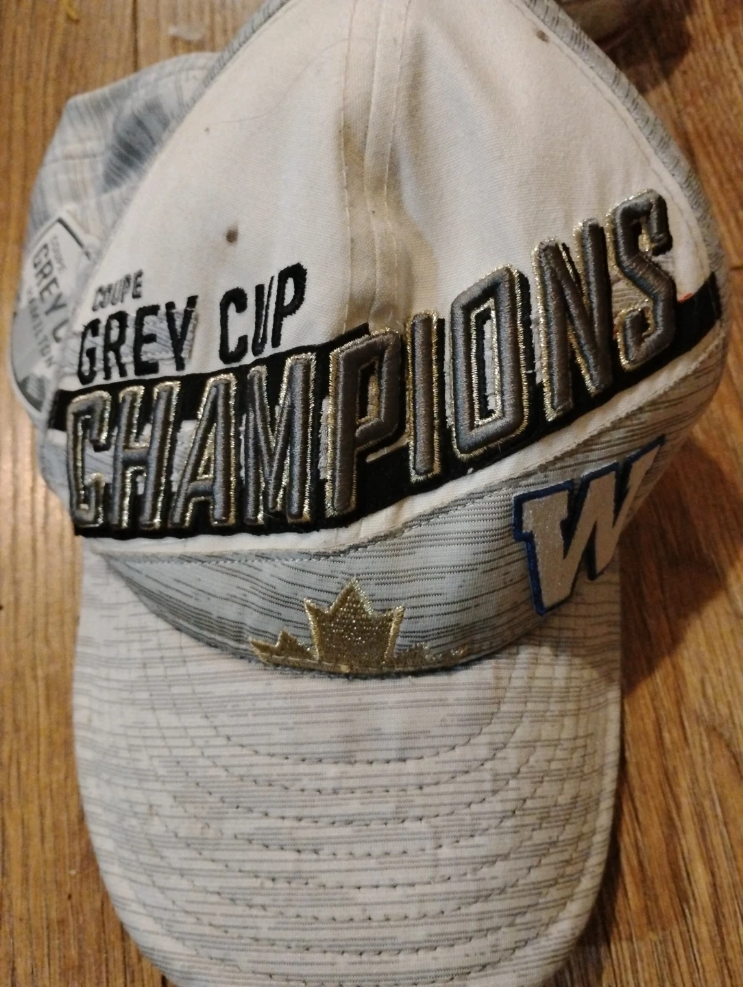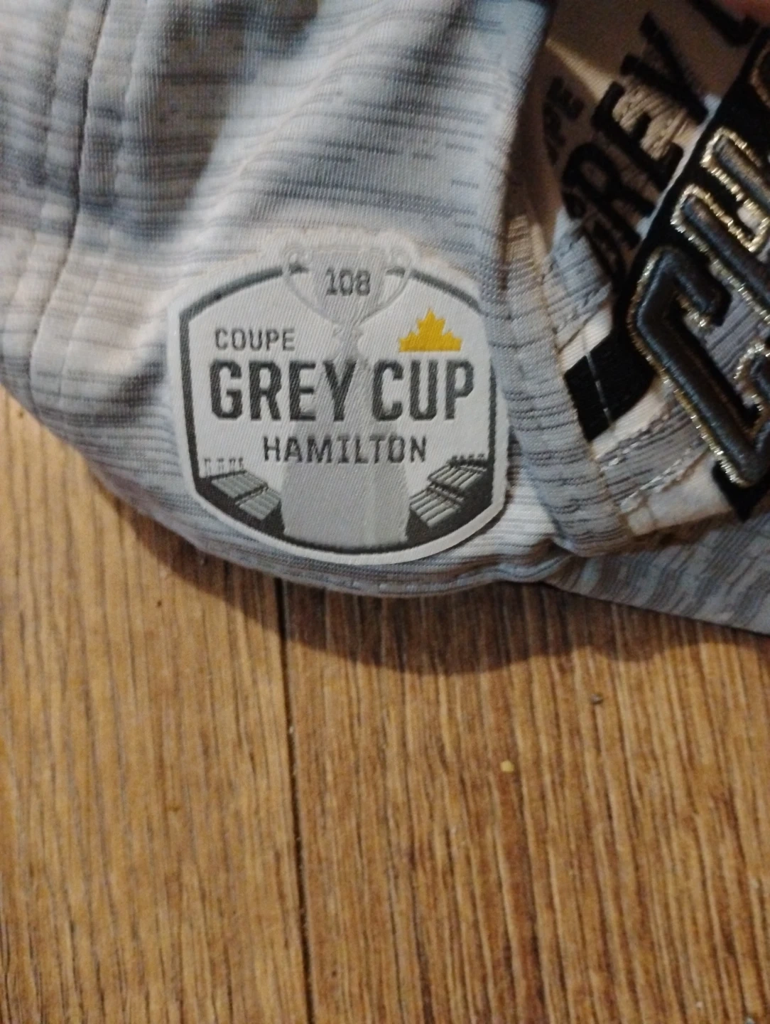 Grey Cup Hamilton champions snapback hat. Features embroidered 'Champions' text and a maple leaf logo. Adjustable strap for a comfortable fit.