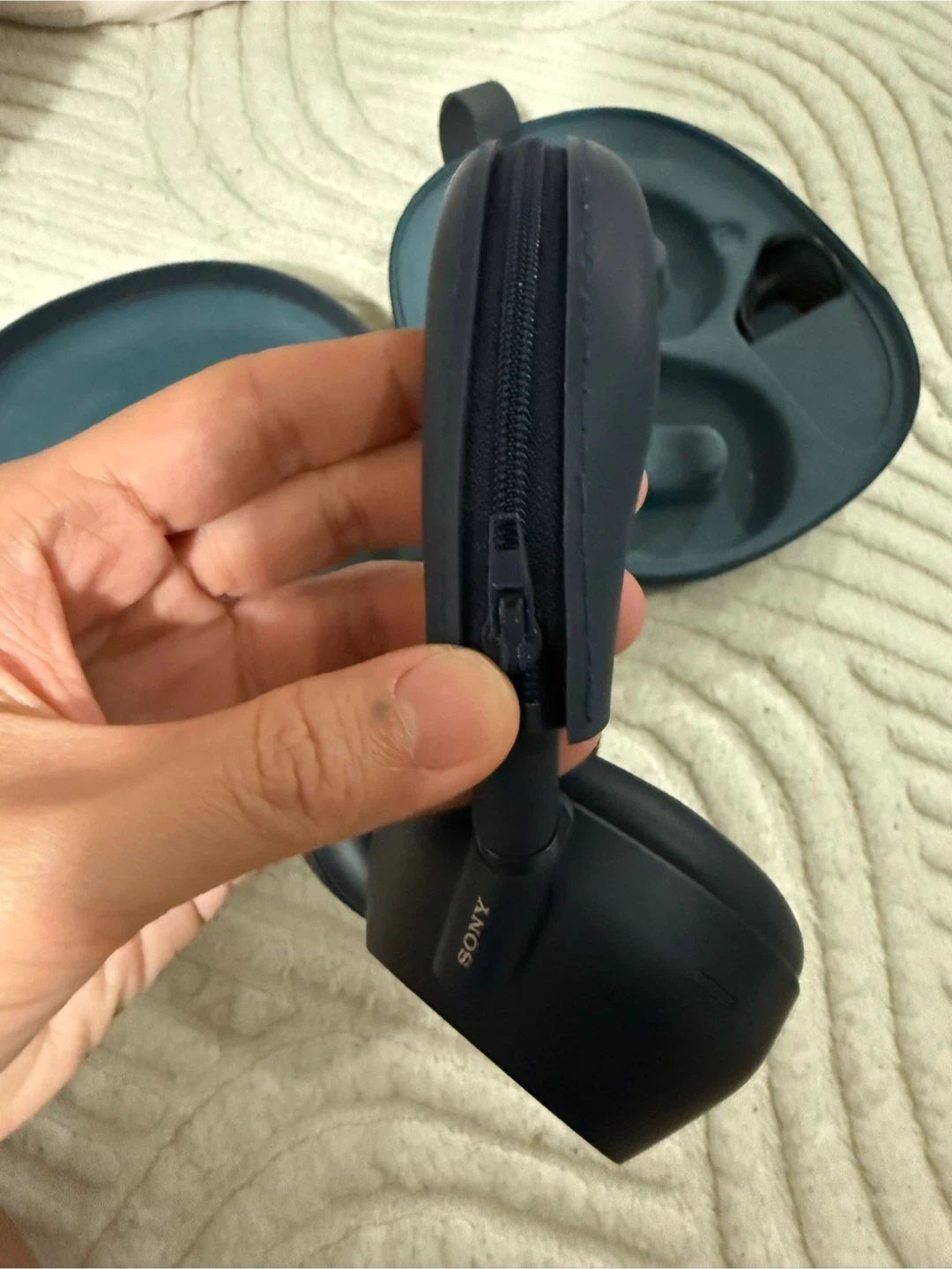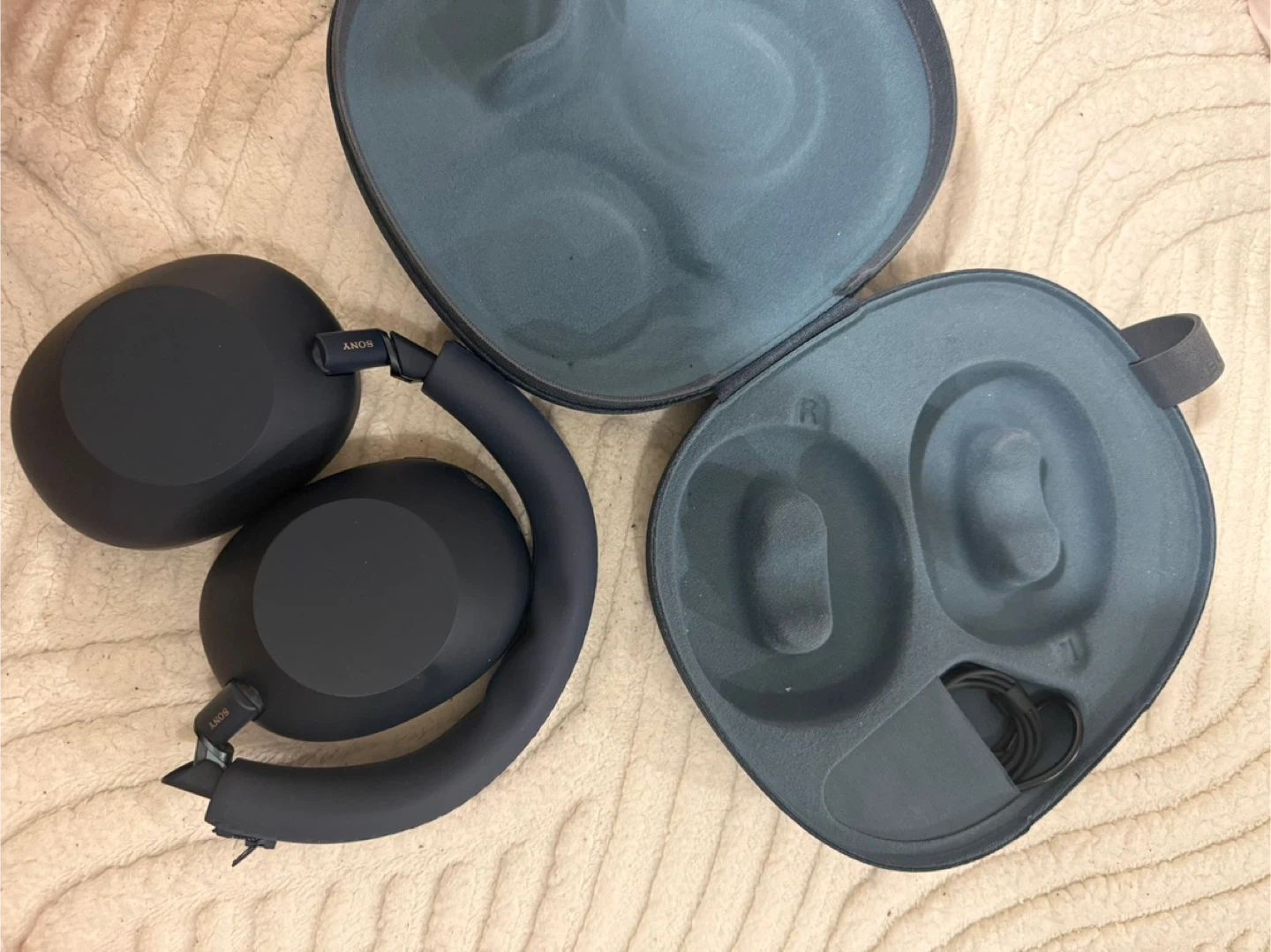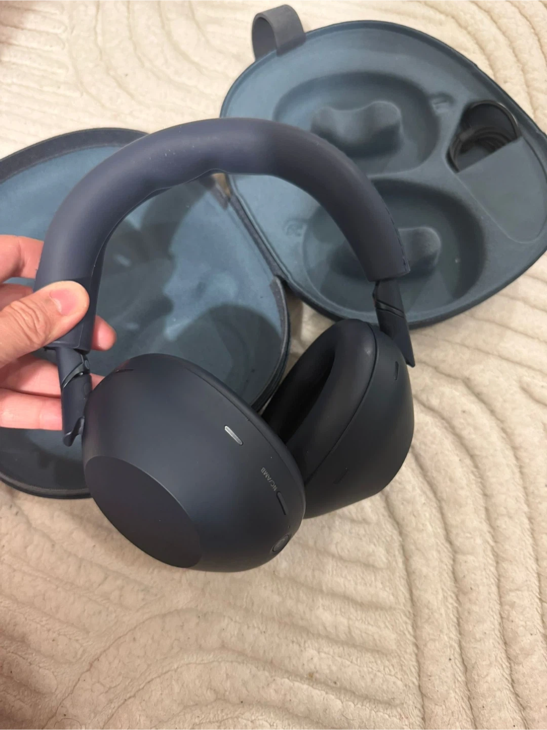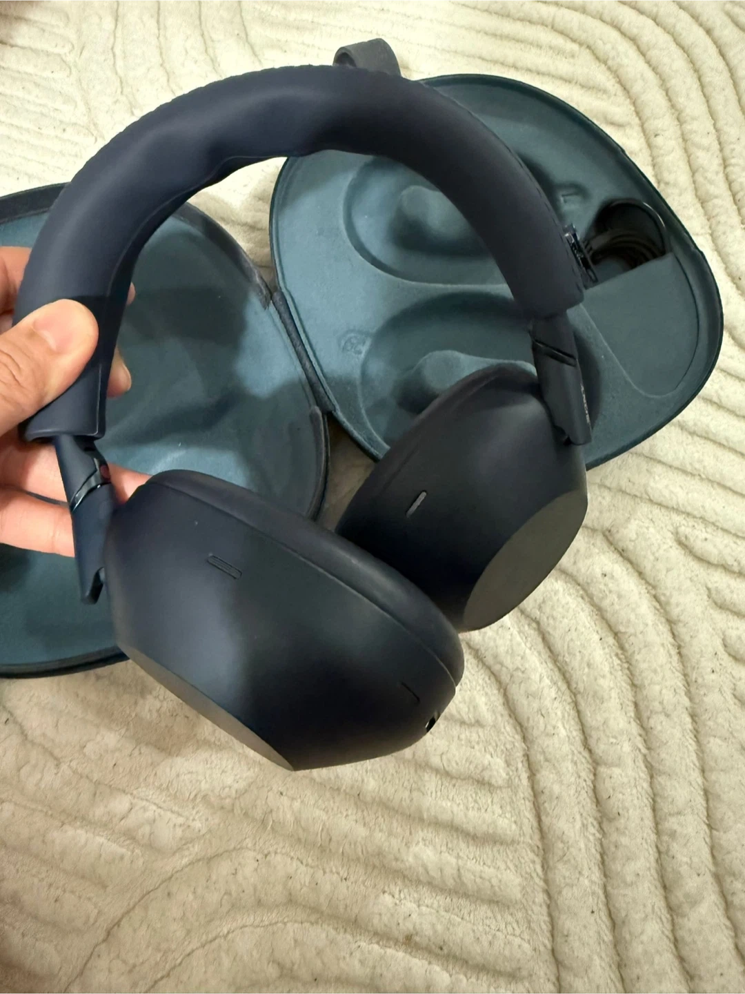 Sony WH-1000XM6 over-ear headphones in navy blue. Includes original case and charging cable. These headphones offer industry-leading noise cancellation and superb sound quality.