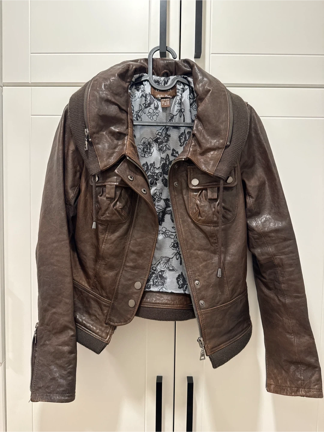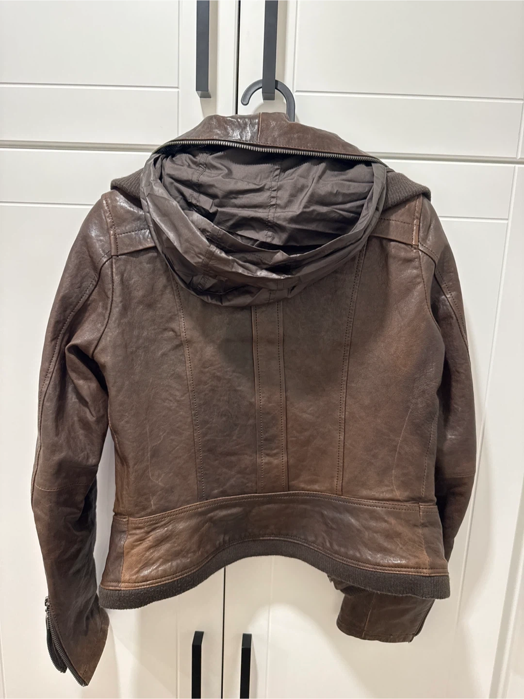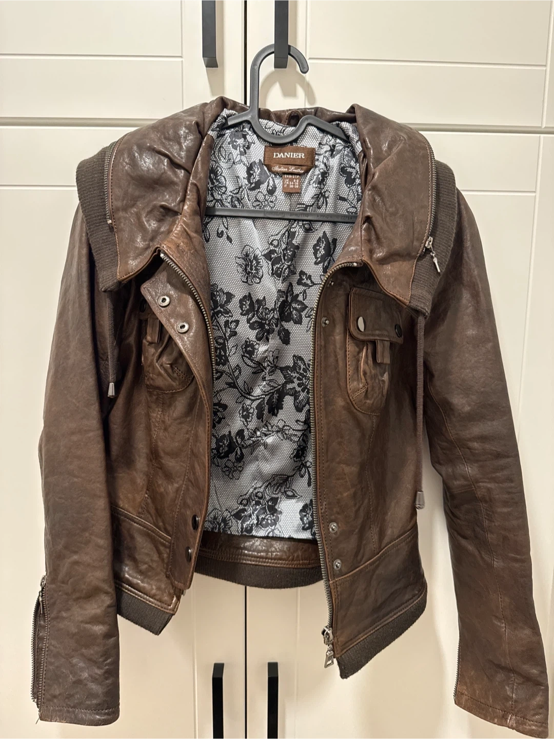 This Danier jacket is made from Italian leather. It features a stylish brown colour and a hidden hood. Size 2XS/ZTP. It was never worn.