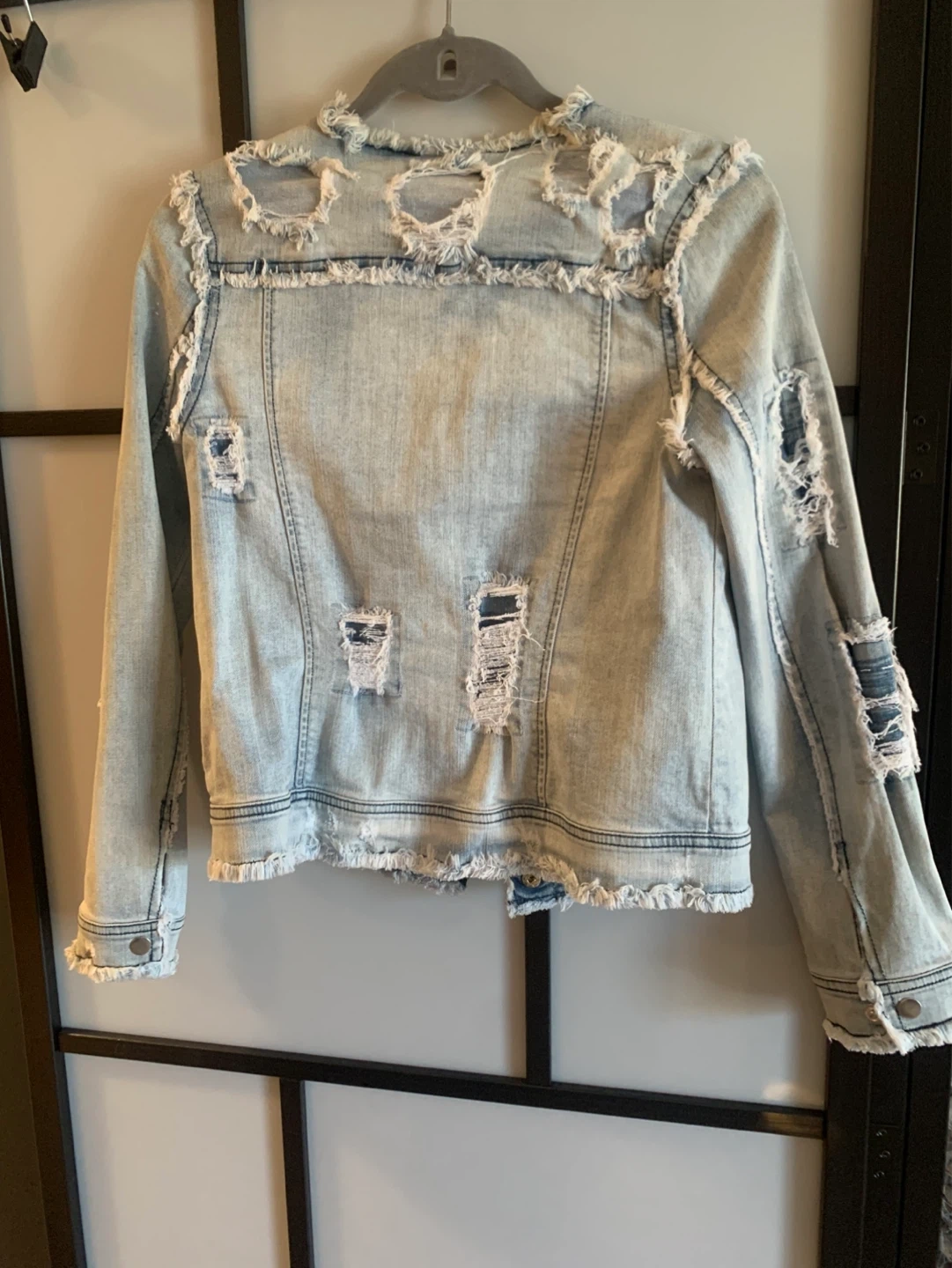 Light wash denim jacket with distressed details throughout. Features a snap on buttons-up front and frayed hem. This jacket adds a stylish edge to any outfit.