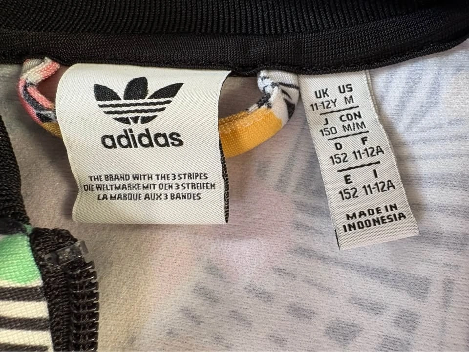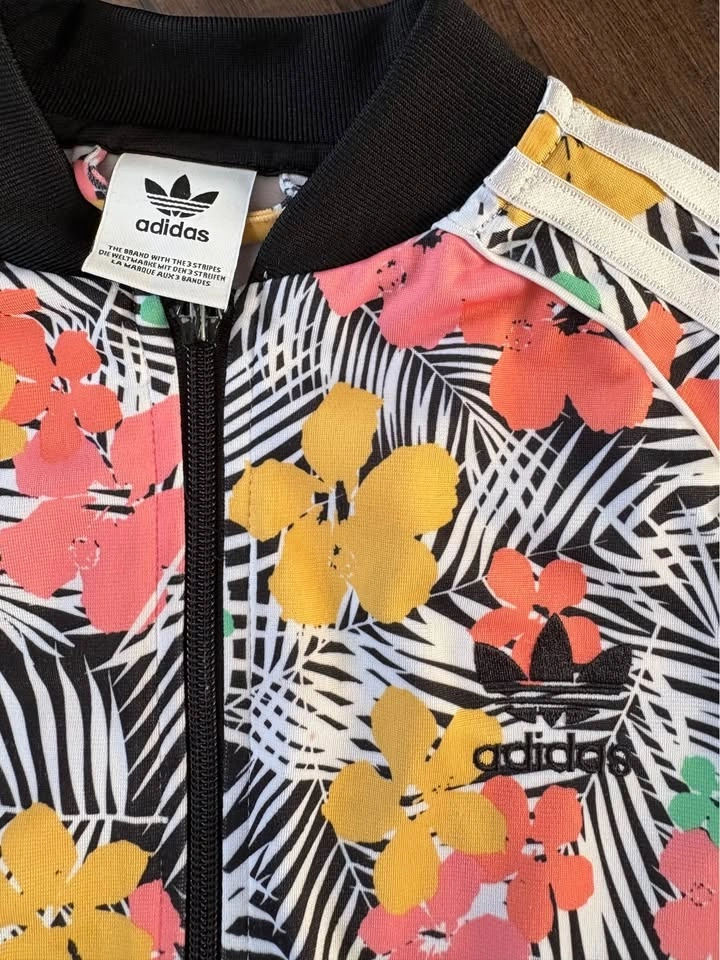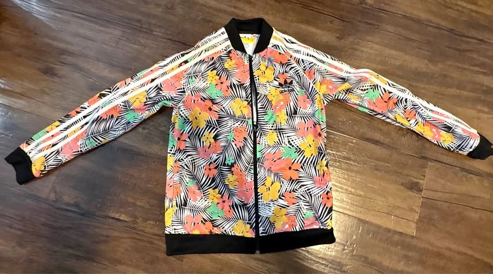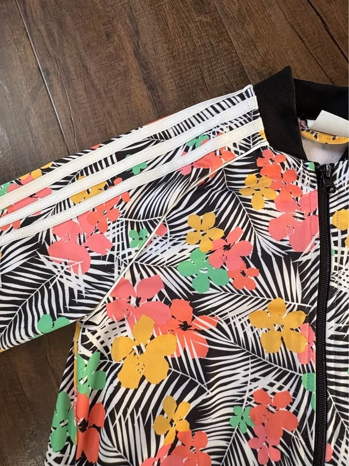 Adidas Girls’ Floral Track Jacket – Size Medium/11-12 Y. Bright and stylish Adidas girls’ full-zip track jacket featuring a colorful tropical floral print. Classic three-stripe design down the sleeves with black ribbed cuffs, collar, and waistband for a sporty look.