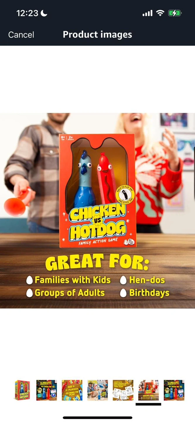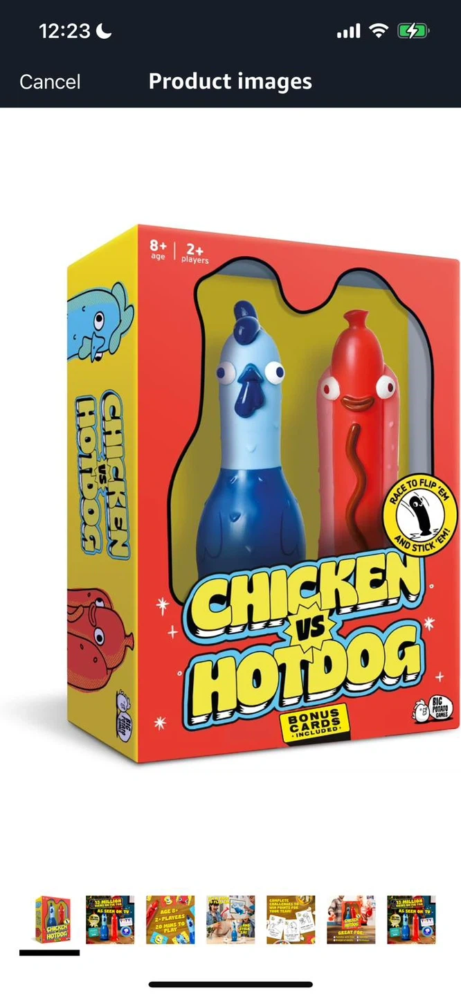 It's the new Chicken vs Hotdog board game, complete with the chicken figure and bonus cards. Great for family game nights with players aged 8 and up! Includes two or more players.
