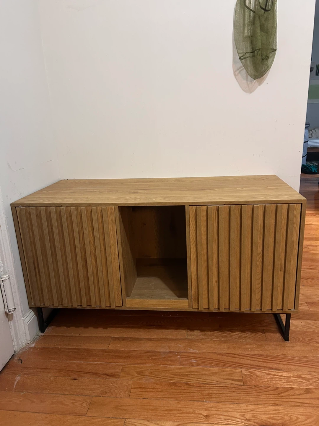 This cabinet is designed to conceal 2 litter boxes, offering a discreet solution for pet owners. It features three separate compartments, two with doors, and is made from a light-colored wood material. The design includes slatted doors and a modern, raised base.