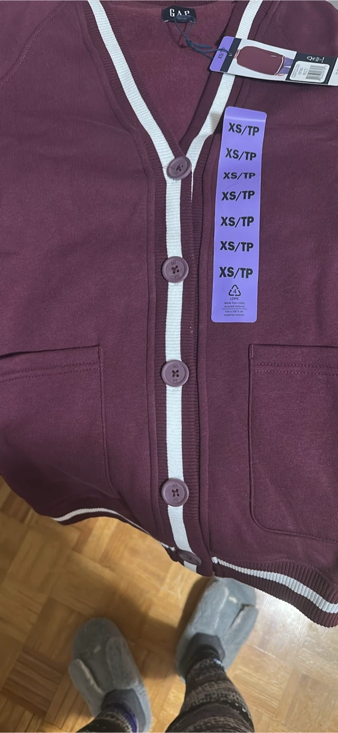 This is a brand new Gap varsity cardigan in size XS! It's a lovely burgundy colour with white stripes. The cardigan is made of 100% cotton and still has the original tags attached. Originally bought for $26.99 at Costco! Have in 3 colours