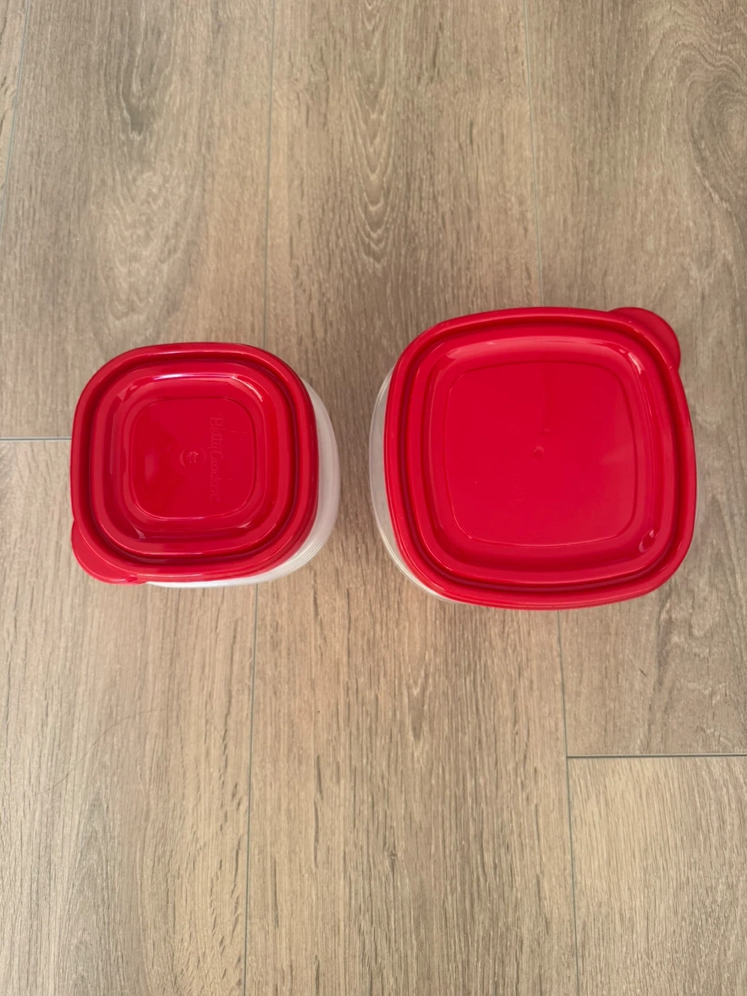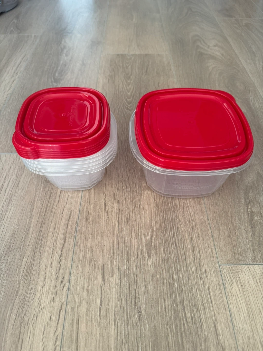 Set of Rubbermaid food storage containers with red lids. Includes multiple sizes for various storage needs. Durable plastic construction. 2 big and 5 small ones. They are never used since i bought sm more then i needed.